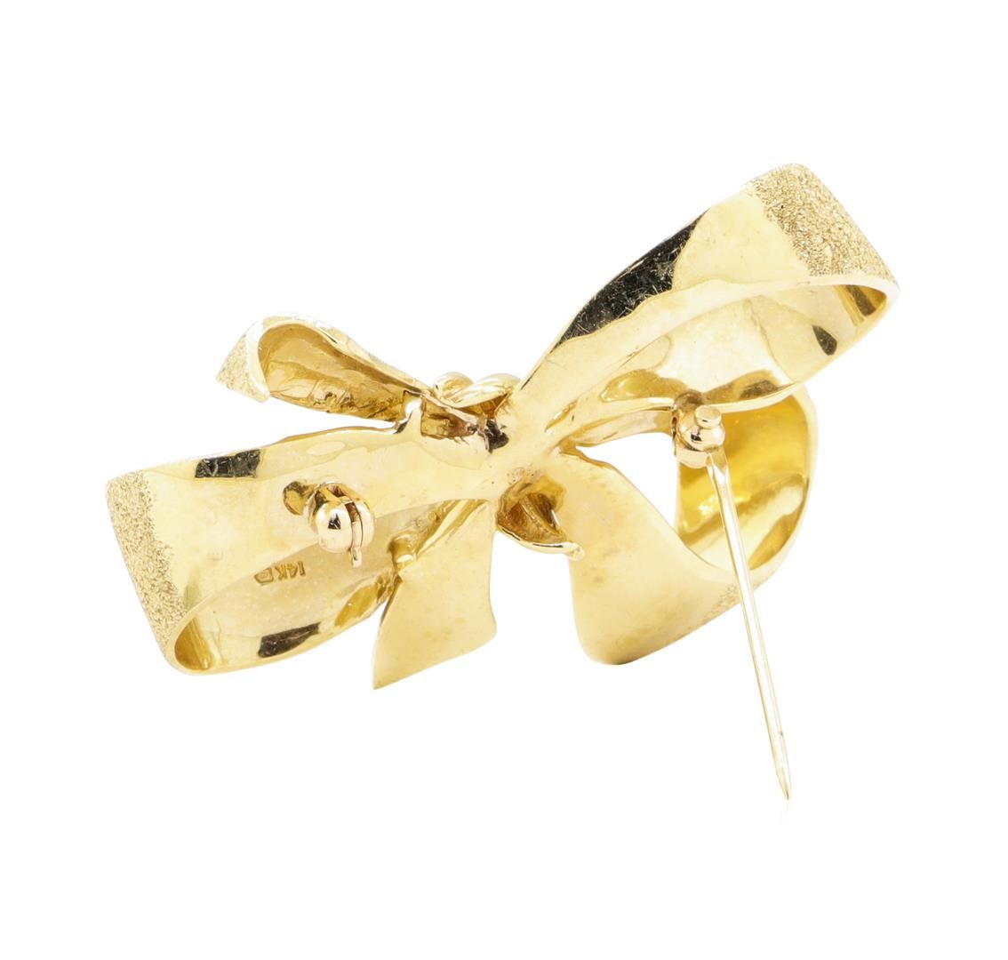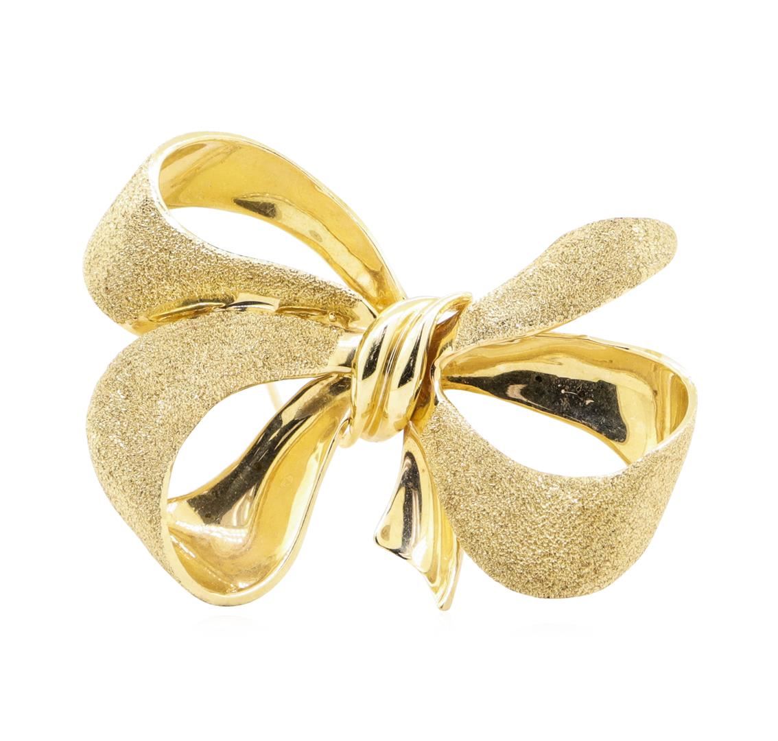 One bow pin measuring 43 by 32 millimeters featuring: 14KT yellow gold weighing 11.2 grams.