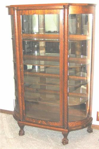 Turn of the century oak bow side china cabinet. Ball & Claw feet. Button handle.4 oak & glass shelves. Mirror back. 61"tx42.5"wx12"interior. Stunning cabinet, well maintained. (5-197)
