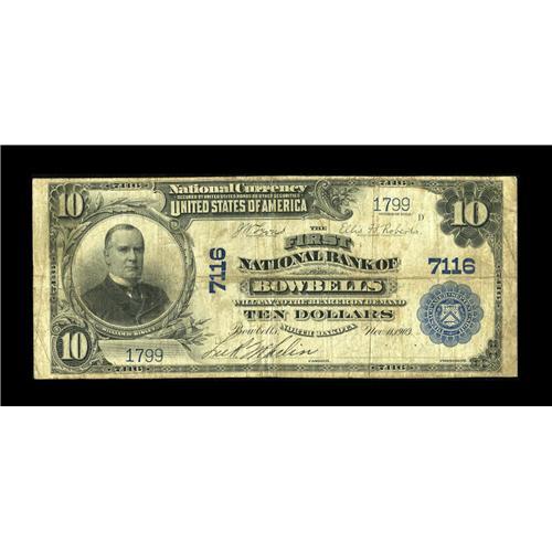 <B>Bowbells, ND</B></I> - $10 1902 Plain Back Fr. 624 <B>The First NB</B></I> Ch. # 7116<BR>A neat note from the only national bank in town. While small notes are occasionally offered from here, large examples are just plain rare, as the census stands at just two pieces, with this the nicer of the pair. <B>Fine.</B></I><BR><BR><b>Shipping:</b> Coin/Currency (<a target="_blank" href="http://www.heritageauctions.com/common/shipping.php">view shipping information</a>)