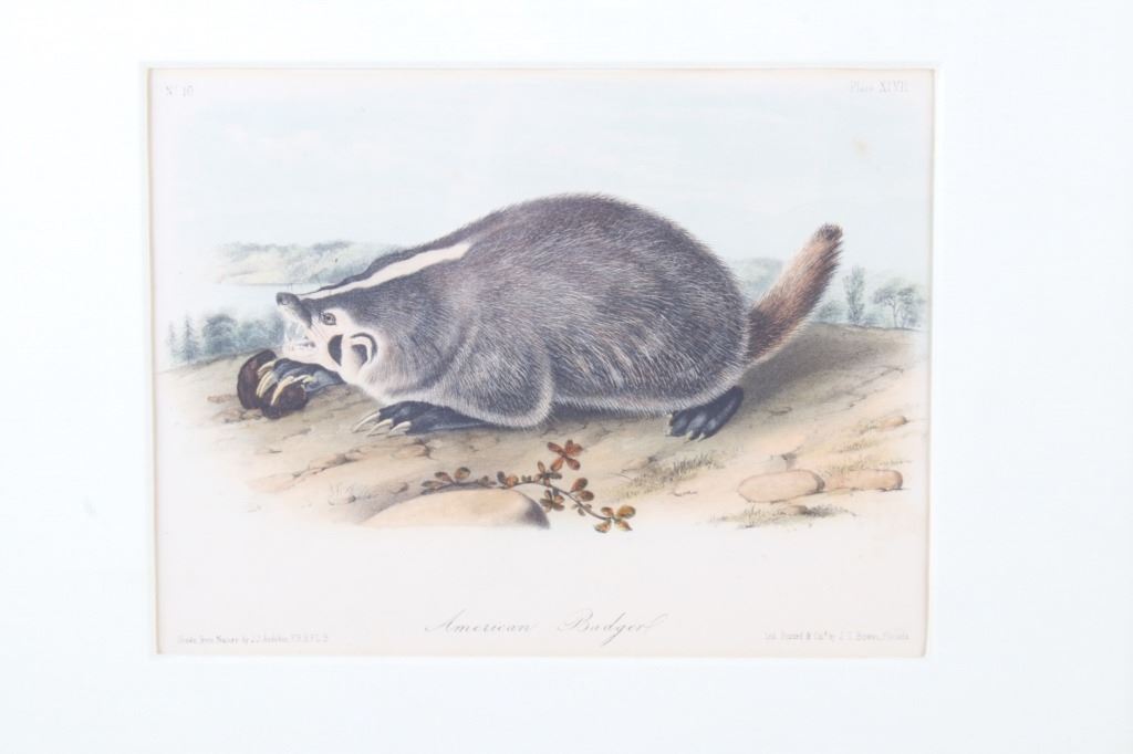 For your consideration is this Bowen Lithograph plate 47, called American Badger from the Viviparous Quadrupeds of North America, a part of the Imperial Folio by John James Audubon. This lithograph was published in Philadelphia between 1839 and 1844 by J.T. Bowen. It was originally issued in 30 parts, 5 plates per part. The measurements of this famed lithograph are 12" x 13 3/4" and the visible art measures 6" x 8".