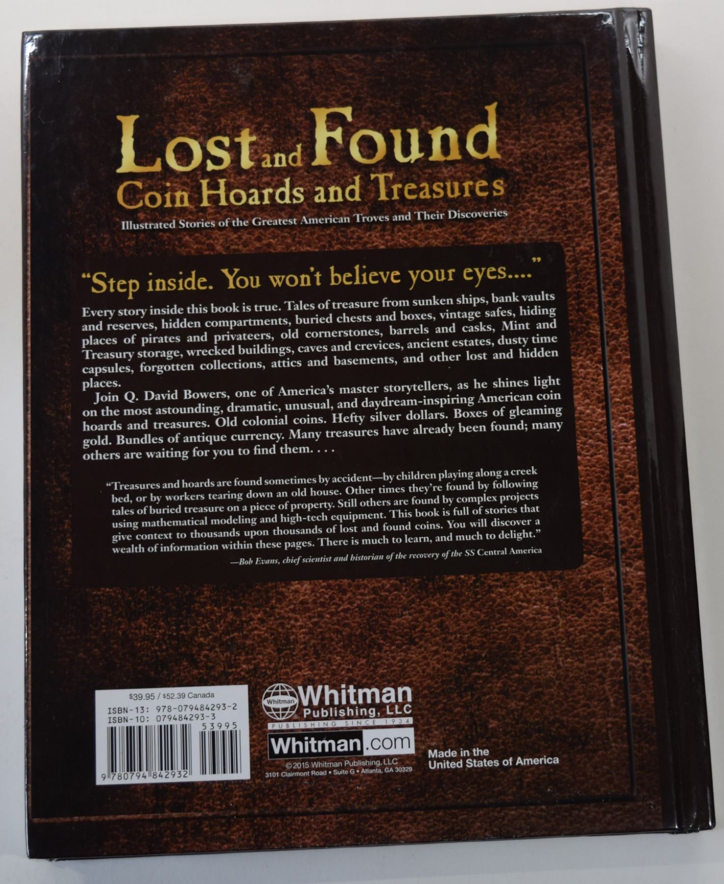 Bowers, Q. David. LOST AND FOUND - COIN HOARDS AND TREASURES - ILLUSTRATED STORIES OF THE GREATEST AMERICAN TROVES AND THEIR DISCOVERIES. Whitman Publishing, LLC. 2015. 4to, 468 pages; Hardcover; Pictoral boards; This large book about hidden and lost treasures deals mostly with land treasures. However, it includes 3 chapters on sunken treasure. Shipwreck treasures described include the “HMS Feversham”, “Le Chameau”, “Lexington”, “Arabia”, “Republic”, “Vineyard”, 1715 Fleet, 1733 Fleet, “SS Winfield Scott”, “SS Yankee Blade”, “SS Central America” and “SS Brother Jonathan”. Subject: History - Buried Treasure