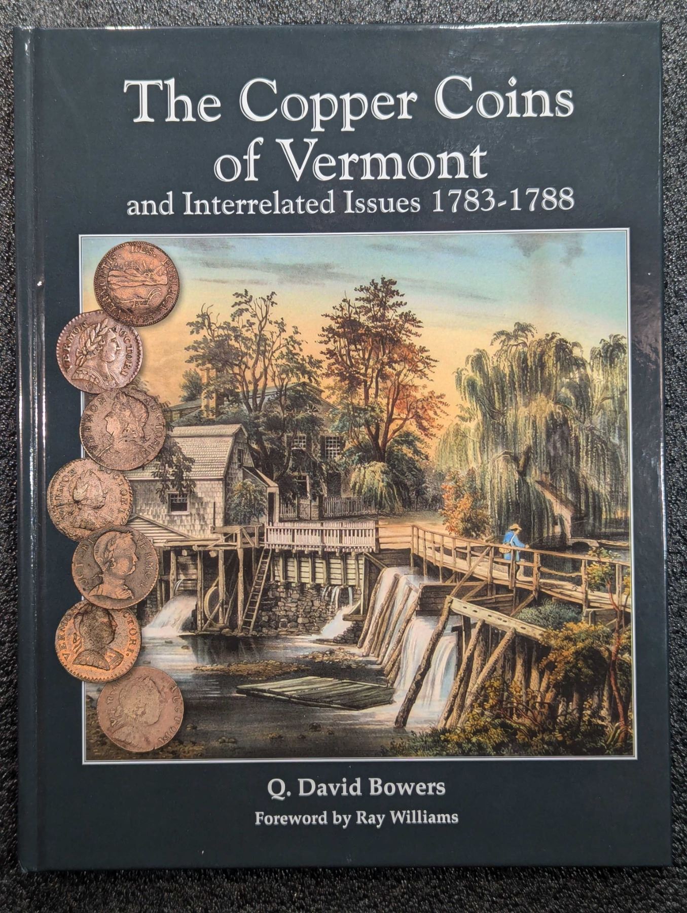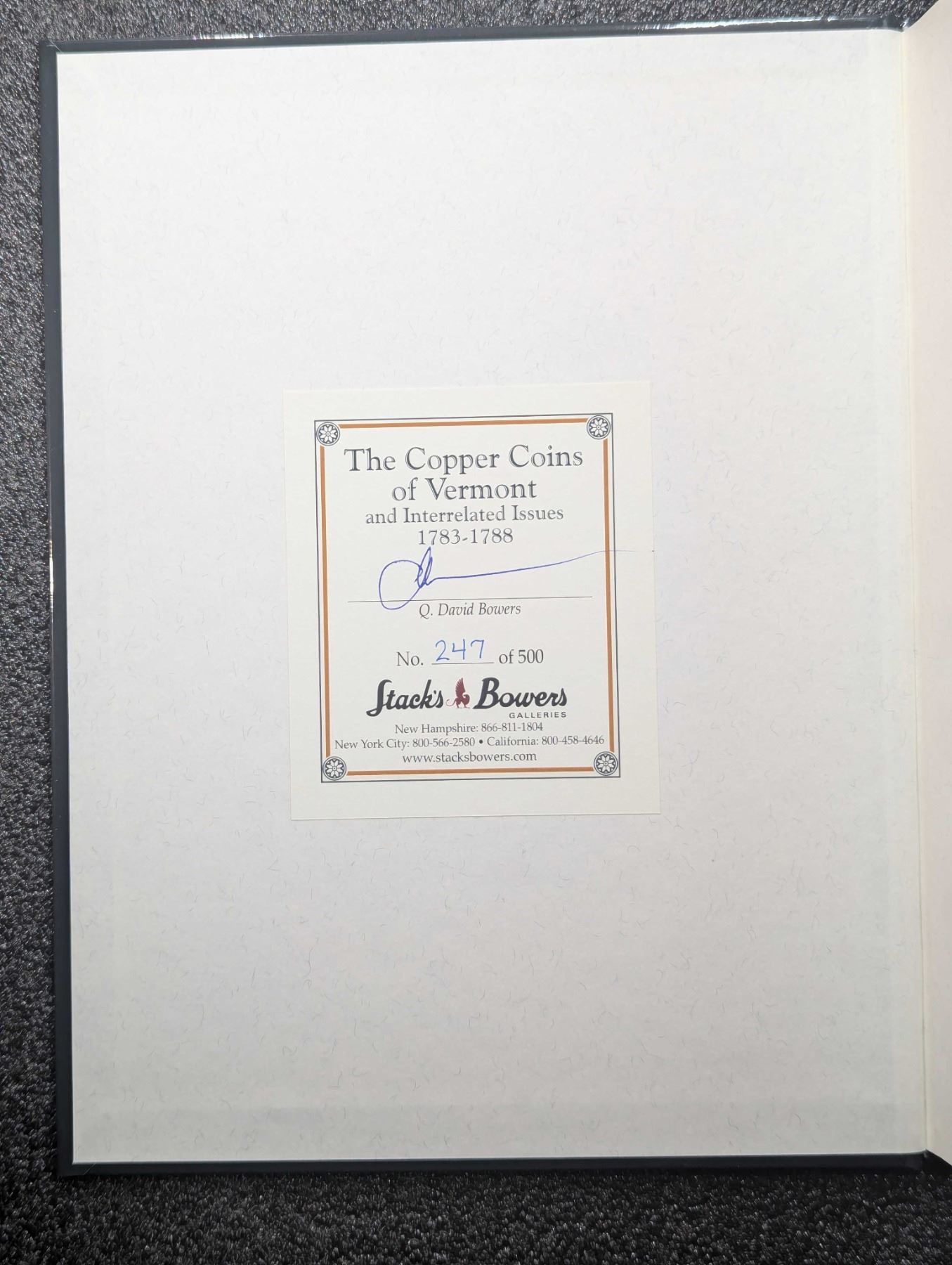 Bowers, Q. David. THE COPPER COINS OF VERMONT AND INTERRELATED ISSUES 1783 - 1788. Stack's Bowers Galleries, New York. 2018. 4to. xii, 163, (1) pages. original pictorial boards. Author signed bookplate. Limited edition #247 of 500 copies. b&w and color coin and historical photos throughout. English text.Fine. Lot weight: 1 lbs 15oz. Subject(s): United States Coinage.