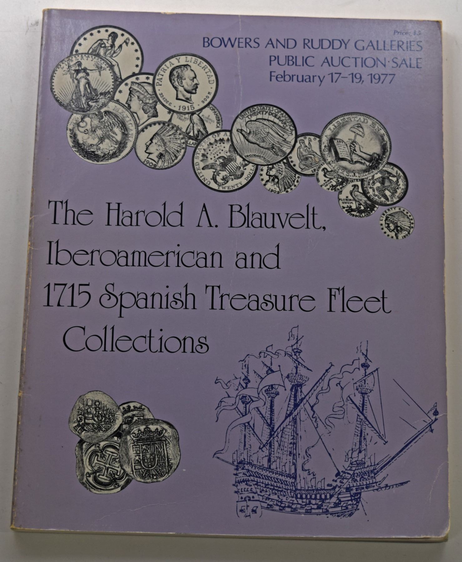 Bowers and Ruddy Galleries. THE HAROLD A. BLAUVELT, IBEROAMERICAN AND 1715 SPANISH TREASURE FLEET COLLECTIONS. February 17-19, 1977. 4to, 192 pages; Softcover; This auction catalog contains 721 lots of gold and silver cobs (comprising about 8500 cobs in total), jewelry (4 lots), and bullion from the 1715 Fleet of Spanish galleons wrecked off the east coast of Florida. It also includes an overview of the 1715 Fleet, its demise, and its subsequent salvage. Subject: History - Sunken Treasure