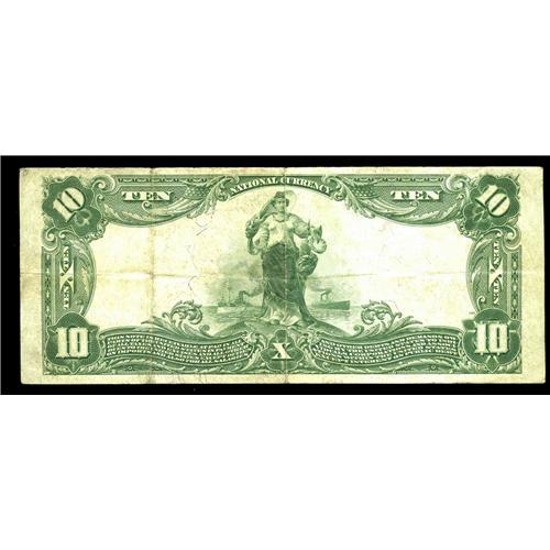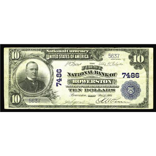 <B>Bowerston, OH</B></I> - $10 1902 Plain Back Fr. 624 <B>The First NB</B></I> Ch. # 7486<BR>A very scarce note from the sole bank to issue in this small Harrison County locale. The new Kelly census shows just six large and three small examples extant from here, with this one of the highest grade specimens known. Pen signed <B>Very Fine.</B></I>