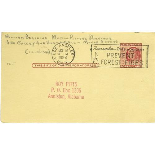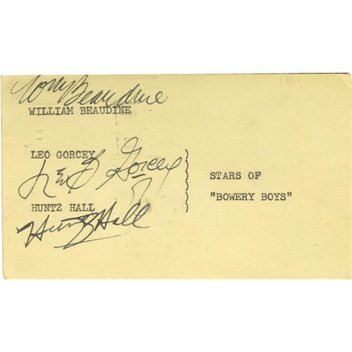 <B>Bowery Boys Signed Card.</B></I> A 3" x 5" postcard signed by Leo Gorcey and Huntz Hall, leads of the Bowery Boys films in the 1940s and '50s, and director William Beaudine in black ink. In Very Fine condition with moderate tanning and some mild wear.<I>Accompanied by LOA from PSA/DNA.</B></I><BR><BR><b>Shipping:</b> Flat Material, Small (<a target="_blank" href="http://www.heritageauctions.com/common/shipping.php">view shipping information</a>) <BR><BR><B>Important no