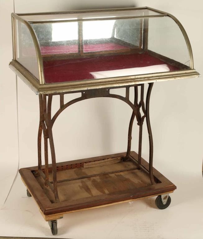 Nickel covered bowfront showcase with rear sliding wood doors . Mounted on sewing machine base with wood platform and wheels for easy mobility. Broken piece in right front corner. Measures 33 1/4"l x 45"h x 23 1/2"w. Because of delicate nature of this item shipping must be arranged by the buyer.