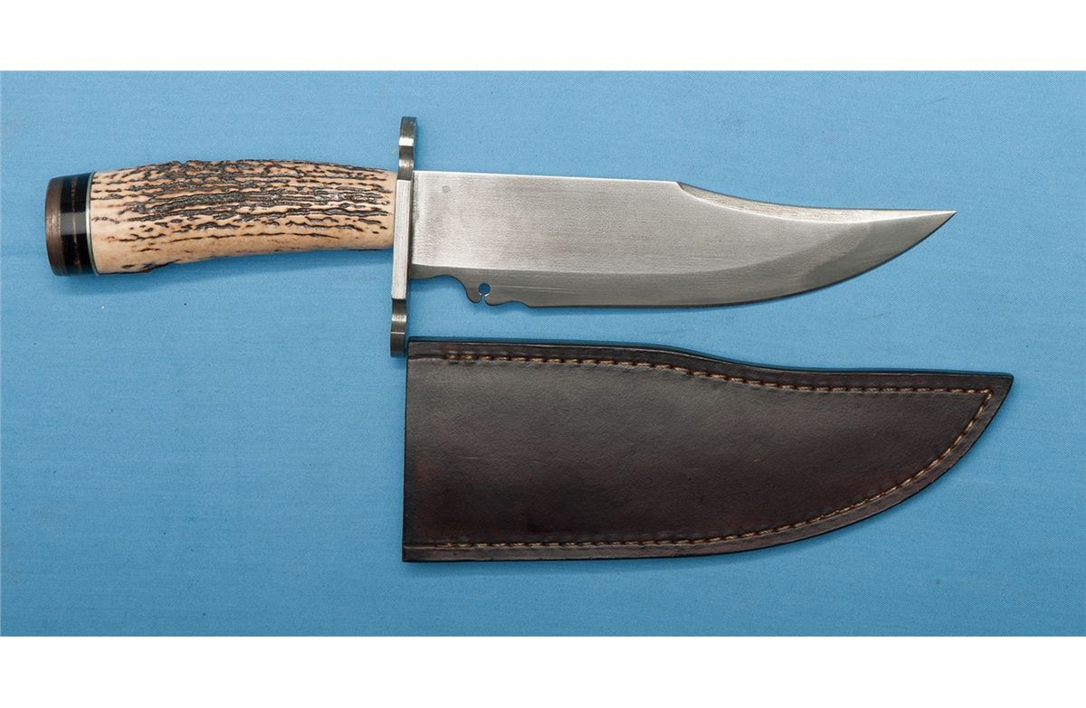 7 3/4" Damascus blade and leather sheath with belt loop. CONDITION: Excellent.
