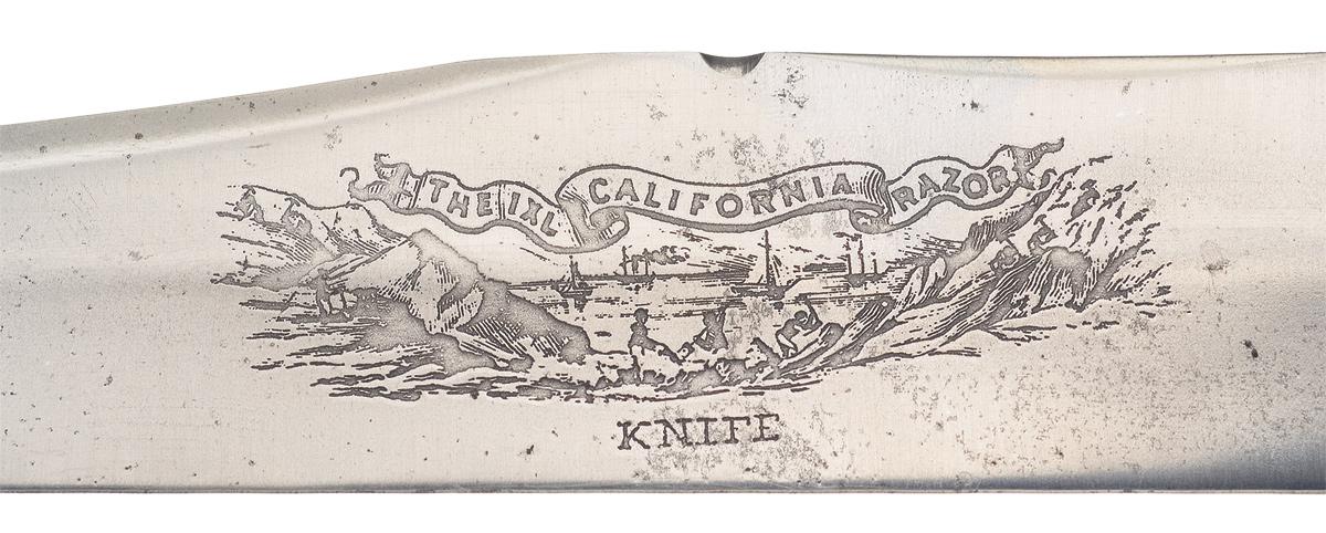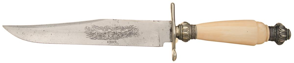 Blade is 8 1/2 inches long, with a 5 inch long back clip, file accents on the spine, and an etched scene of the California coast with "THE IXL CALIFORNIA RAZOR" in a banner above and "KNIFE" below. The etching is a later addition. Silver hilt fittings, with dual quillions, floral and ribbed patterns around the collar and pommel, and a smooth one piece ivory grip with a contoured pattern at the rear.