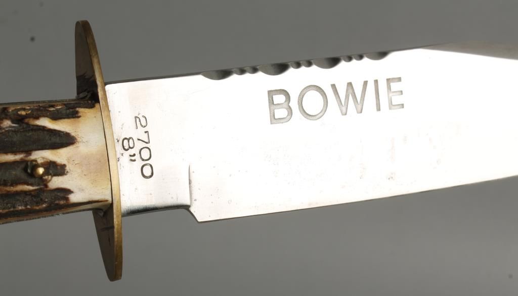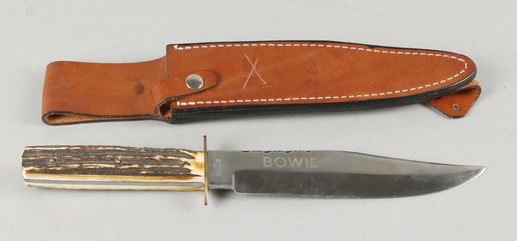 By Olsen Knife Co, stag handle brass guard 12.5" overall with 8" blade, leather sheath.