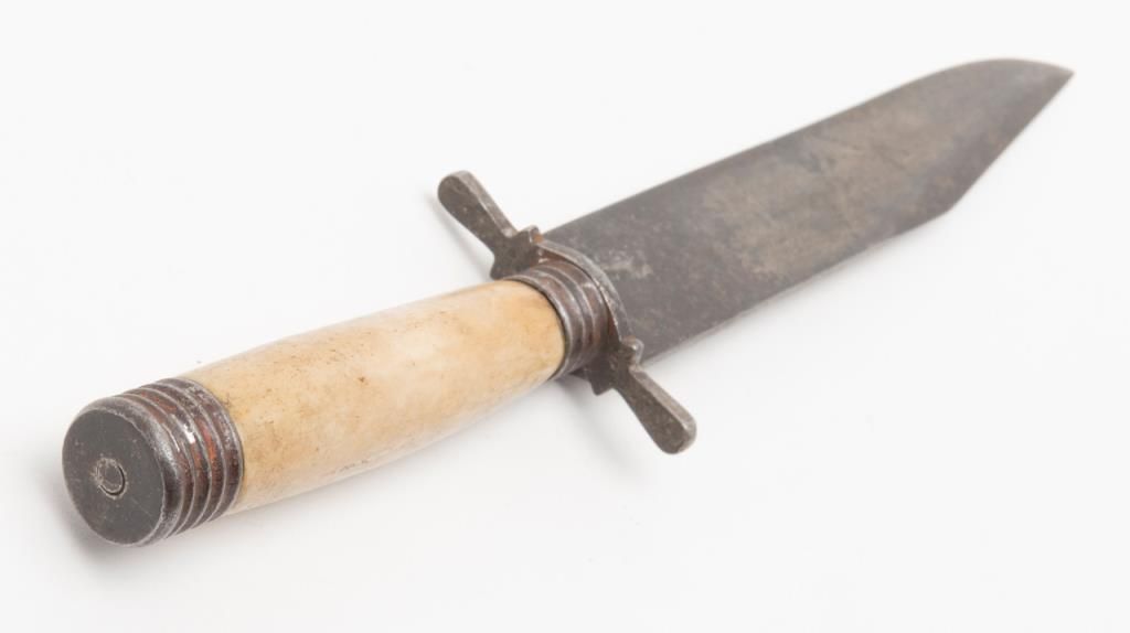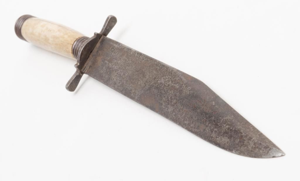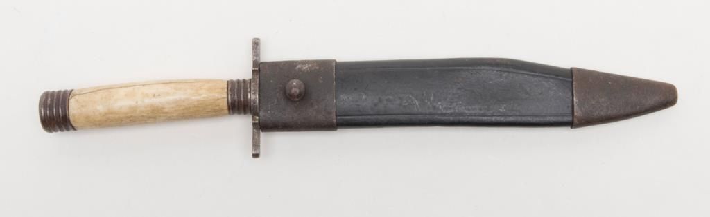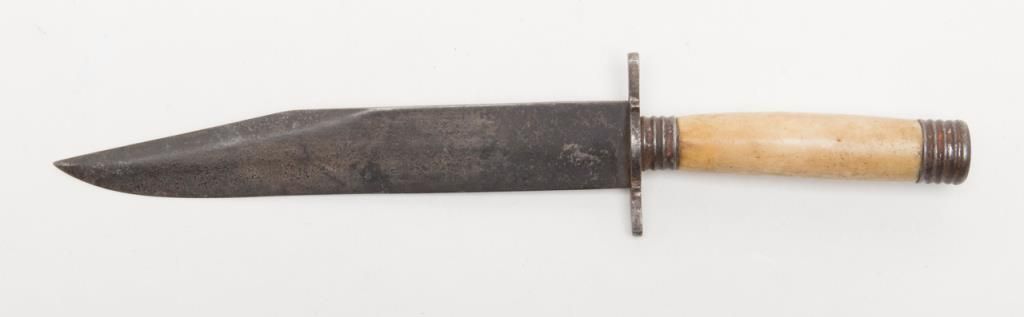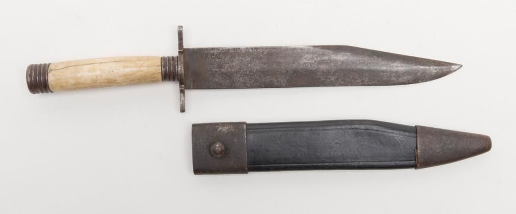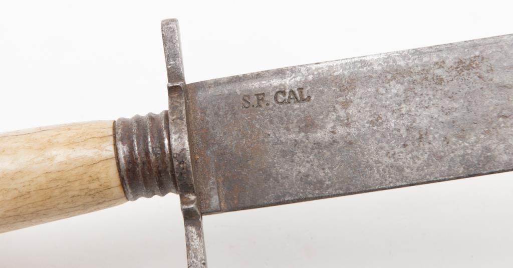 Bowie knife with bone grip and simple iron guard and pommel, approx. 14” overall with right side marked “S.F. CAL” horizontally (?) ; with leather sheath displaying iron tip and throat. Est.: $300-$600.