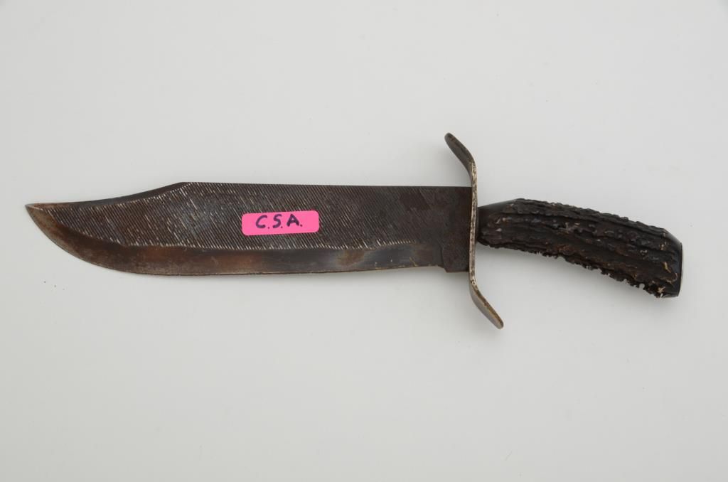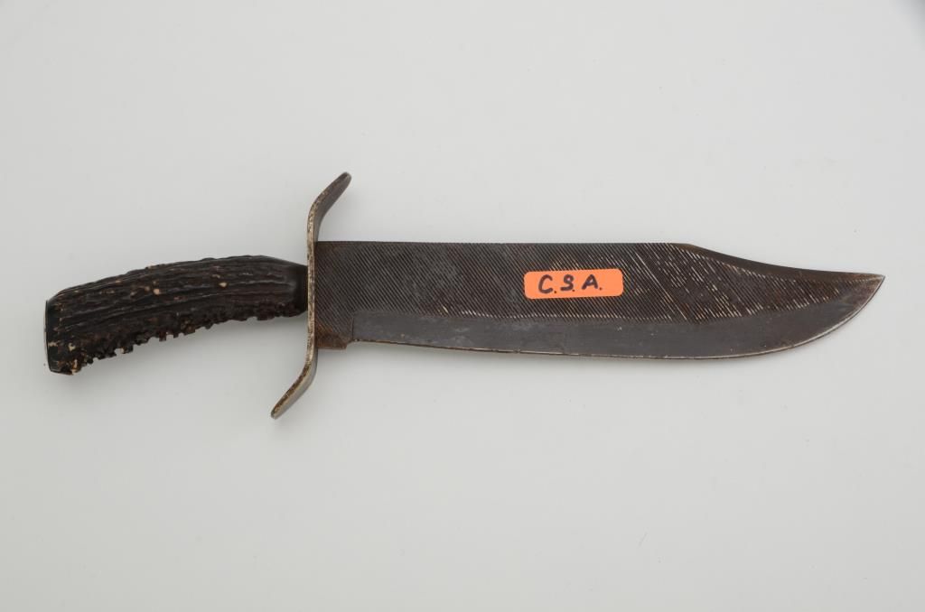 Bowie knife with stag grip, hand-made, approx. 14-1/2” overall with a 10” clip point blade; old tag notes “Bowie made from a hasp file. Confederate”; possible 20th Century. Est.: $150-$300.
