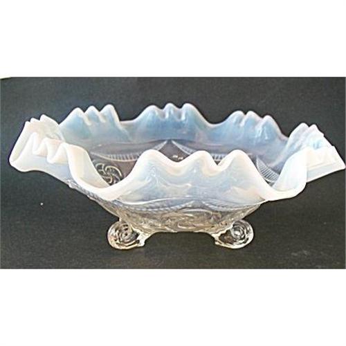 Lovely white opalescent wedding basket or bowl by Northwood in the Ruffles and Rings pattern. This pattern was first made by Jefferson Glass and then Northwood began making it in 1906. This ruffled beauty has 3 flowers and 3 sets of 4 interlocking rings.