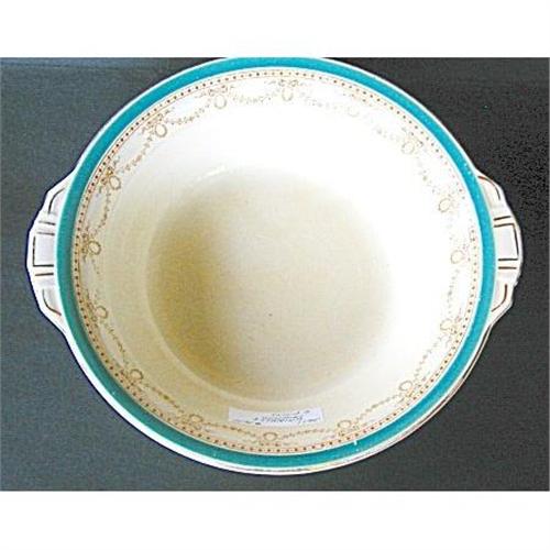 Vegetable bowl 10.0 in the lovely Dunrobin pattern by Grindley China Co. of England. Turquoise or Aqua band with tan dots and enhanced by ribbons and flowers. This large serving or vegetable has some wear to gold trim but lovely pattern.