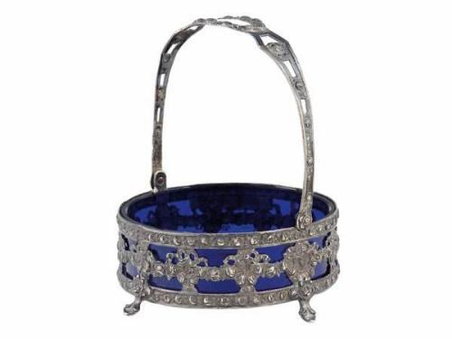 Silver, 72 g, garland decoration, blown and cut blue glass lining. Restored handle. Marked: German, 800-mark of fineness. Hungarian import mark, Late 19th century. Size: 12 cm