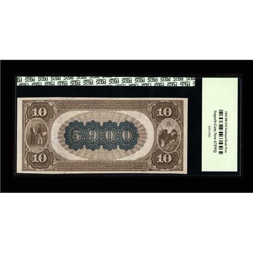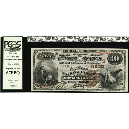 <B>Bowling Green, KY</B></I> - $10 1882 Brown Back Fr. 490 <B>The Citizens NB</B></I> Ch. # (S)5900<BR>An absolutely gorgeous example which is perfect for the type collector who desires only the finest, as this specimen has every attribute any collector could ever hope for. The colors are rich and vibrant, the pen signatures are bold, and the note brims over with full and complete originality. PCGS <B>Superb Gem New 67PPQ,</B></I> a note certain to delight even the most particular of collectors.