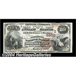 Bowling Green, KY - $10 1882 Brown Back Fr. 490 The Citizens NB Ch. # (S)5900An absolutely gorgeous example which is perfect for the type collector who desires only the finest, as this specimen has every attribute any collector could ever hope for. The colors are rich and vibrant, the pen signatures are bold, and the note brims over with full and complete originality. Gem Crisp Uncirculated, a note certain to delight even the most particular of collectors. <BR><BR><B>Important notice:</B> Heritage usually auctions material at the rate of 200-250 lots per hour. On some occasions eBay Live bid software or the Internet may not be able to keep up with the pace of the auction. We recommend placing a realistic absentee bid now as insurance to avoid disappointment. Occasionally the auctioneer may eliminate or reject an eBay Live bid, and the auctioneer may also reopen a lot after the close of the eBay live bidding (usually because we missed an audience bid), and may reject your bid even if it shows you as the winning bidder. By bidding via eBay Live, you agree that Heritage may award the lot to another bidder at its sole discretion under the circumstances described above or any other reasonable circumstances. Since eBay bids are not shown to us until we open the lot on the floor, we treat those bids just like floor bids. In most cases the floor responds before the eBay bid is presented to us, due to Internet lag time, so for consistency we have made it a policy that floor bids are always considered first over tie eBay live bids. Also please note that all Heritage lots purchased through eBay Live carry a 20% Buyer's Premium. Please make sure you read the Terms and Conditions before you bid. <BR><BR><B>IMPORTANT ANNOUNCEMENT ABOUT RESERVES:</B> Heritage now divulges all reserves on its web site 7 days before every auction. If you want to know whether the reserve on this lot has been met, and if not, what the reserve amount is, please visit this lot page on the HeritageCoin.com web site, or email: bid@HeritageGalleries.com