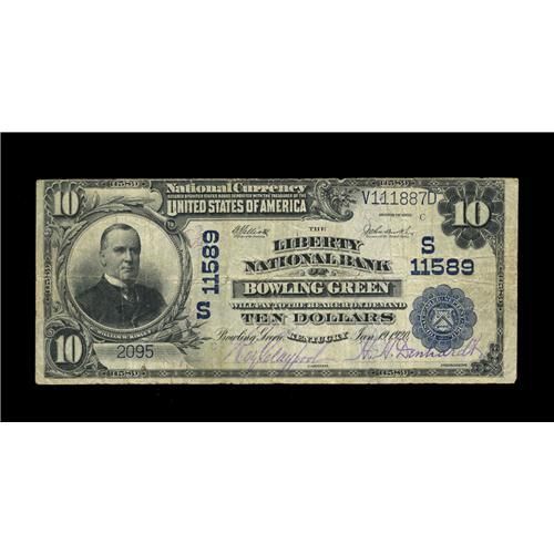 <B>Bowling Green, KY</B></I> - $10 1902 Plain Back Fr. 633 <B>The Liberty NB</B></I> Ch. # (S)11589<BR>This is one of Bowling Green's truly scarce banks, with the census now standing at just three examples extant. This is one of the listed pieces from this obscure institution, which lasted just four years before bowing out in early 1924. <B>Fine+.</B></I>