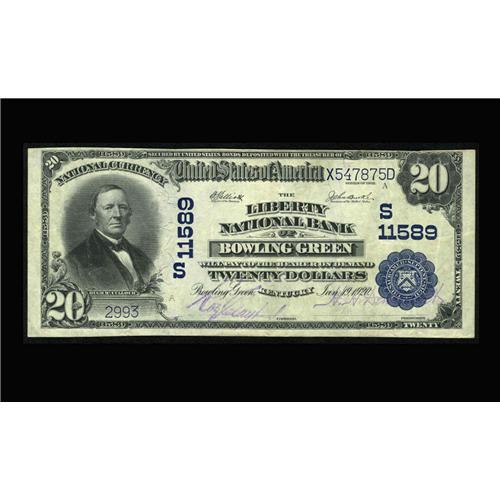 <B>Bowling Green, KY</B></I> - $20 1902 Plain Back Fr. 659 <B>The Liberty NB</B></I> Ch. # (S)11589<BR>This piece, which Bill Gale obtained privately, is new to the census, and is by a huge margin the finest note known from this very scarce bank. With the exception of the one piece in the Martin holdings, this offering is the first time since 1981 that any example from here has been offered at public sale. Sharp <B>Very Fine-Extremely Fine,</B></I> with bright purple signatures.
