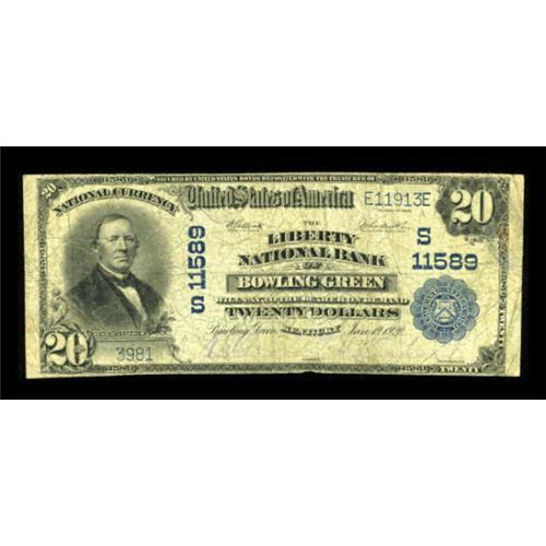<B>Bowling Green, KY</B></I> - $20 1902 Plain Back Fr. 659 <B>The Liberty NB</B></I> Ch. # (S)11589<BR> Extensive use in the Kentucky channels of commerce did not compromise the integrity of the paper on this issue. To date, only about a half dozen notes have been reported from this Warren County issuer. <B>Very Good.</B></I><BR><BR><b>Shipping:</b> Coins & Currency (<a target="_blank" href="http://www.heritageauctions.com/common/shipping.php">view shipping information</a>)
