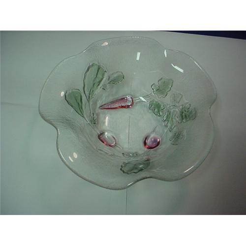 Clear glass bowls with frosted scalloped edges, showing tinted vegetables colored with light green leaves on two red radishes and one carrot, which are the bubbles in the glass. I call it my "radish dish". It is in very good condition, no scratches or chips. Two are available, at $44.00 for the pair or can be sold separately at $22 each.