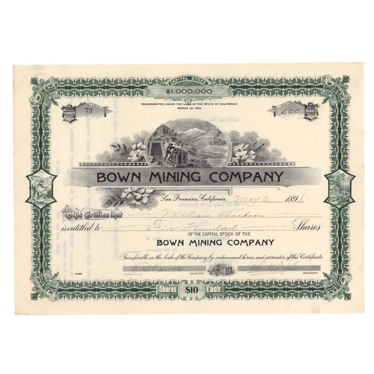 1898, California. Stock certificate for five hundred shares. Green / Black. Vignette of a miner pushing a full cart out a shaft at to center. Ornate green border includes vignettes of miners working at left and right edges. Smaller vignette of dog guarding lockbox at bottom center. Blind embossed company seal. Uncancelled. Very Fine.