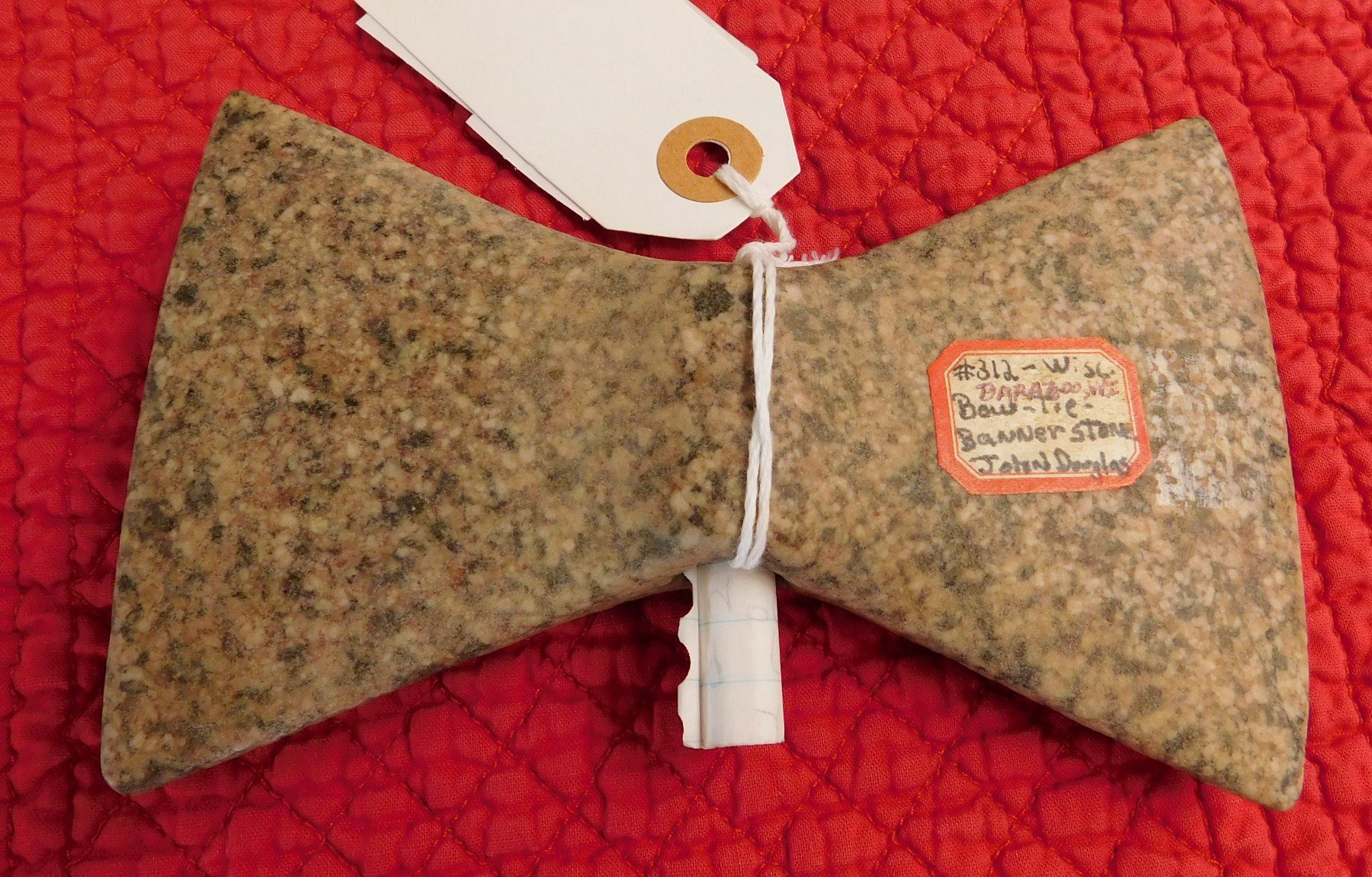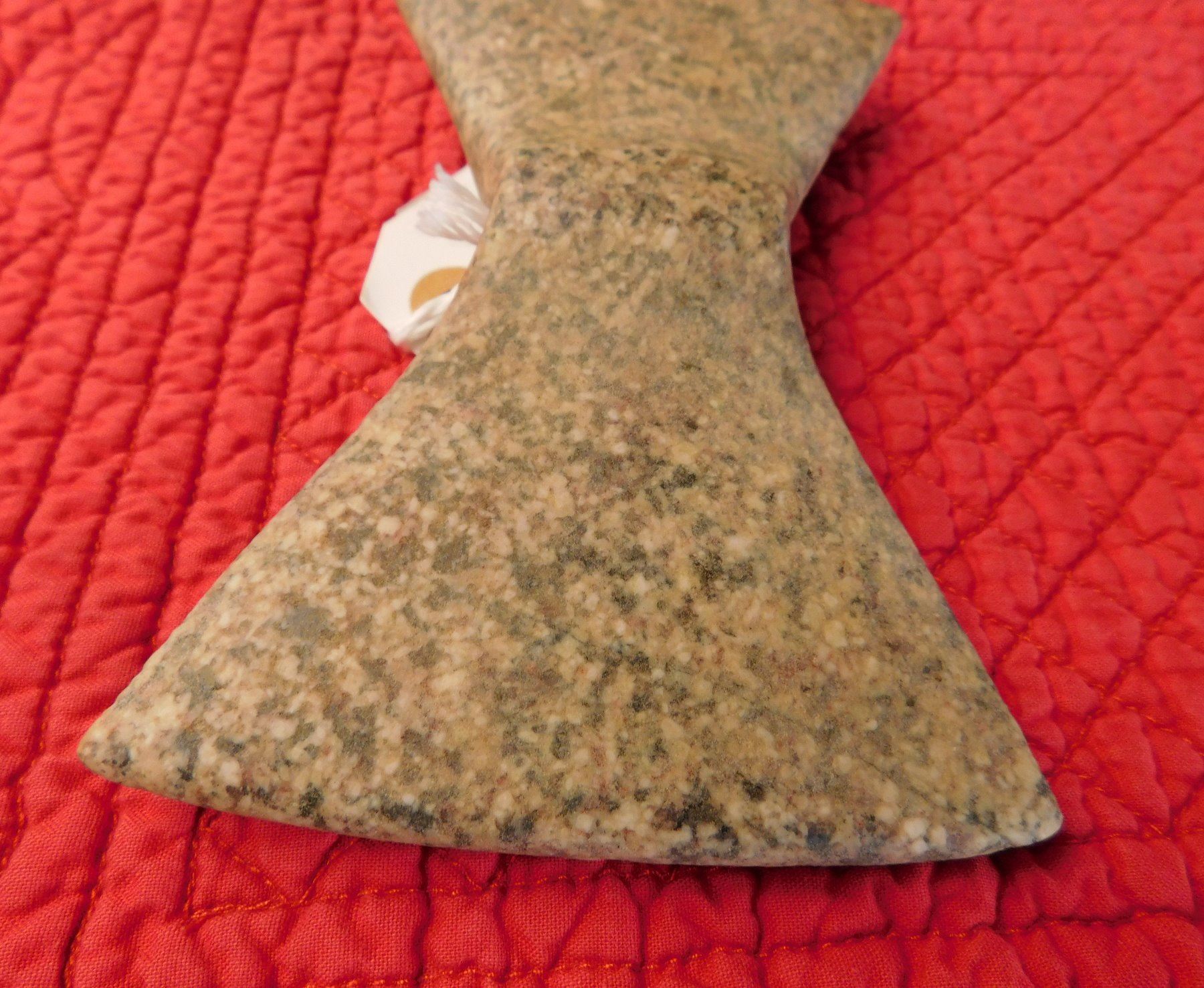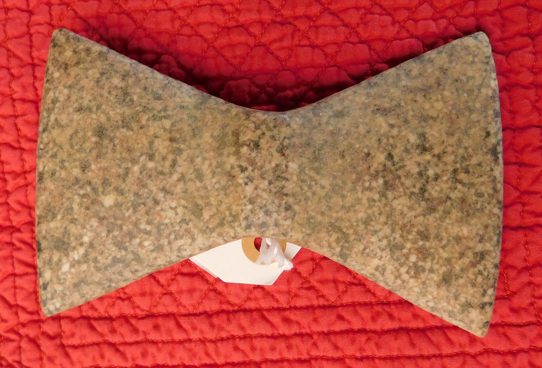 Bowtie Bannerstone, pre-historic item. Made of granite, the item measures 5 3/4" x 3 1/2". Wisconsin. Found by Dave Knight in 1979, Columbia County, Wisconsin. Ex-John Douglas. Condition: Good, see images. Shipping: $22.50 w/insurance and signature.