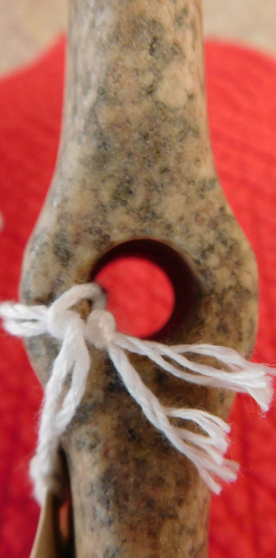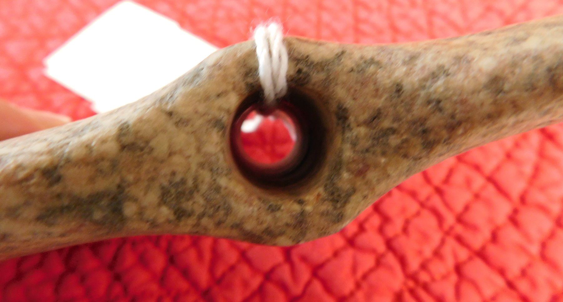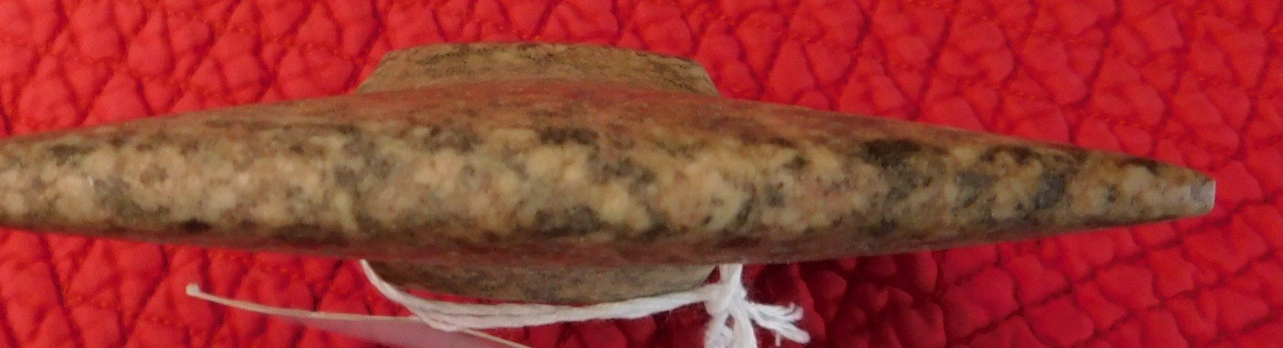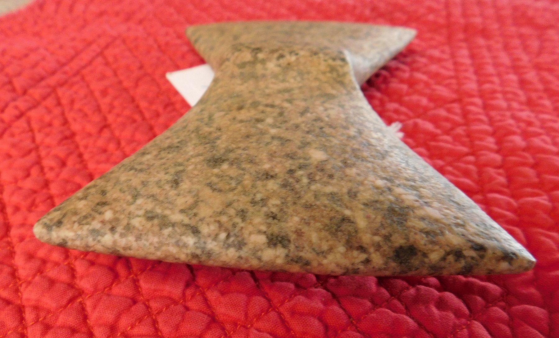 Bowtie Bannerstone, pre-historic item. Made of granite, the item measures 5 3/4" x 3 1/2". Wisconsin. Found by Dave Knight in 1979, Columbia County, Wisconsin. Ex-John Douglas. Condition: Good, see images. Shipping: $22.50 w/insurance and signature.