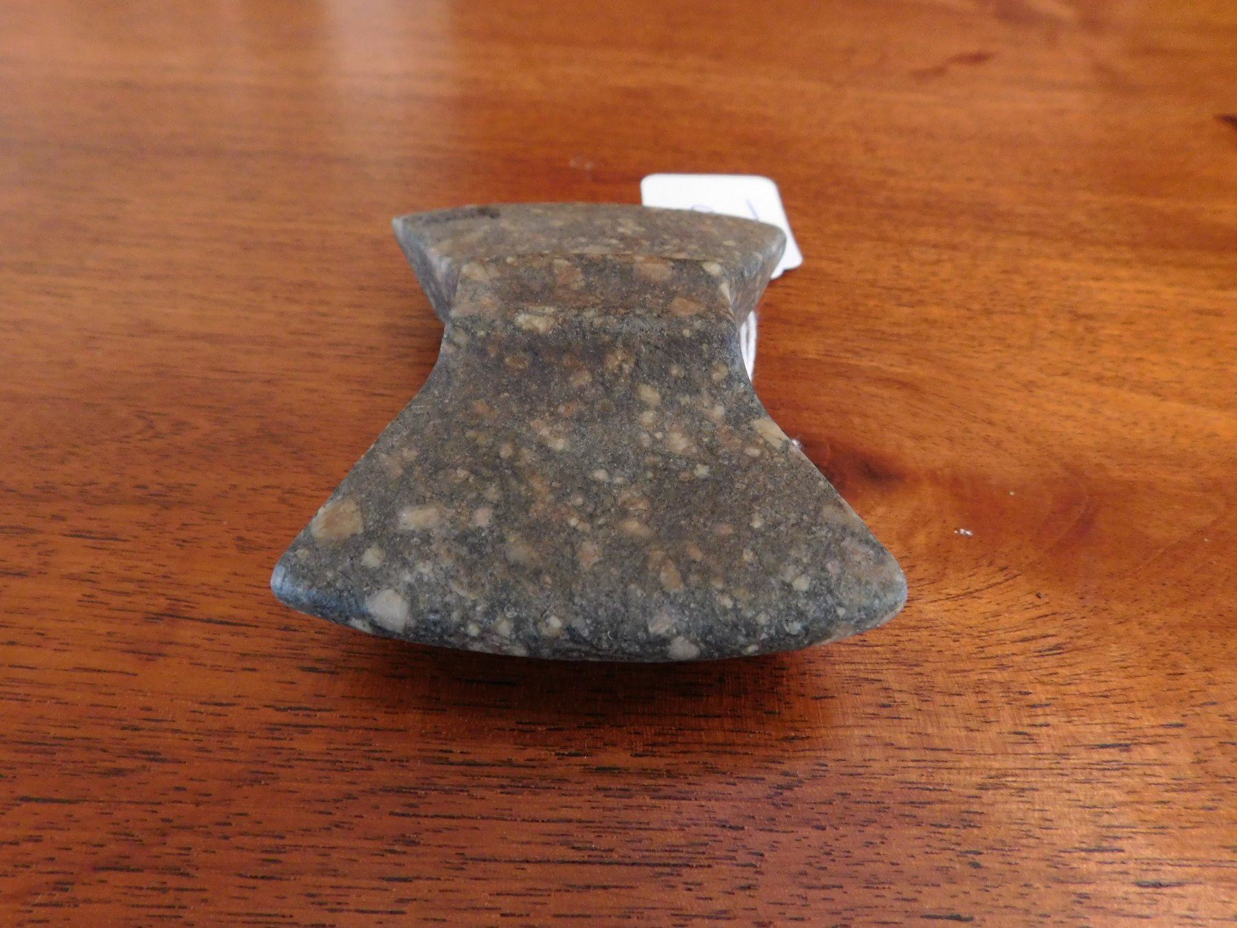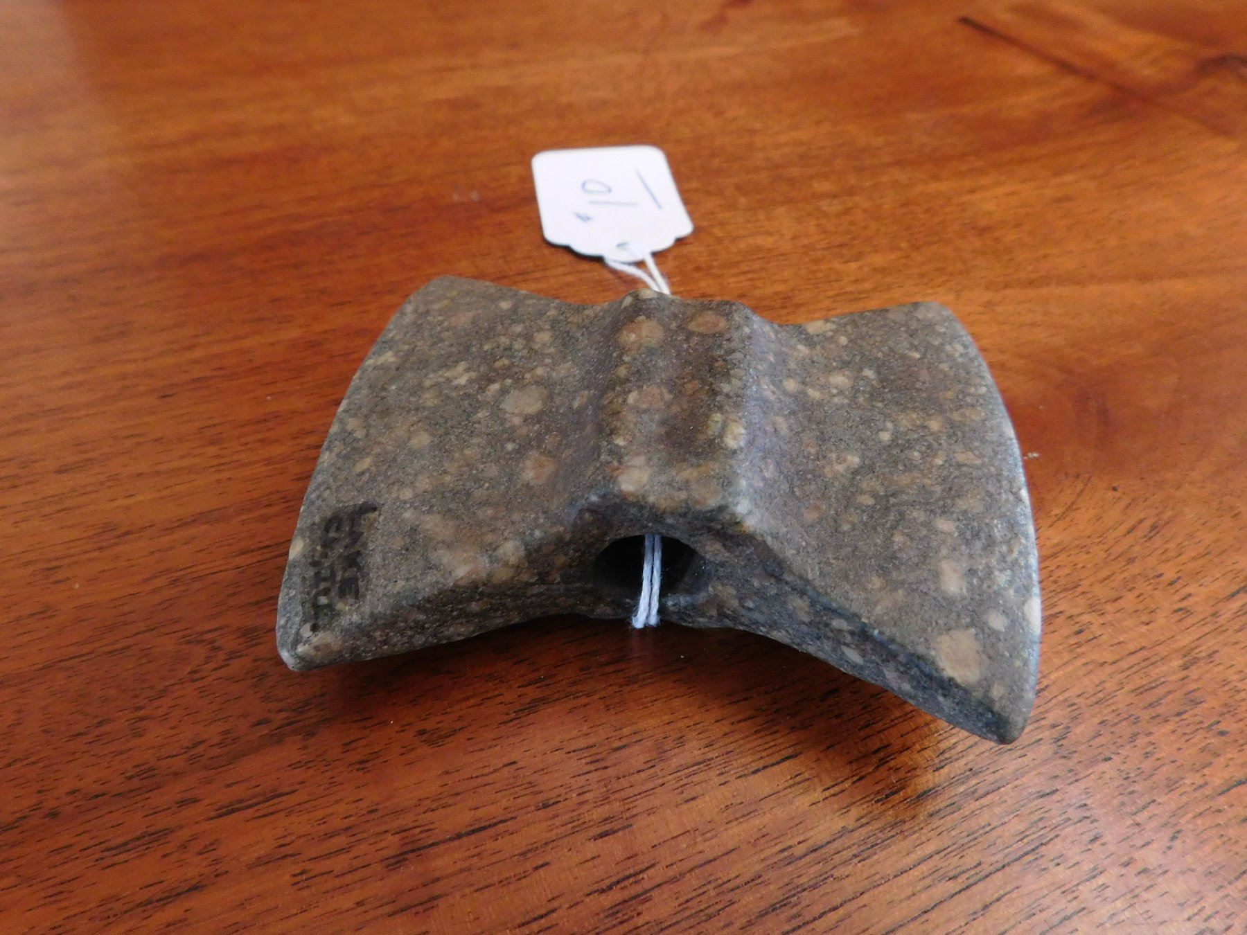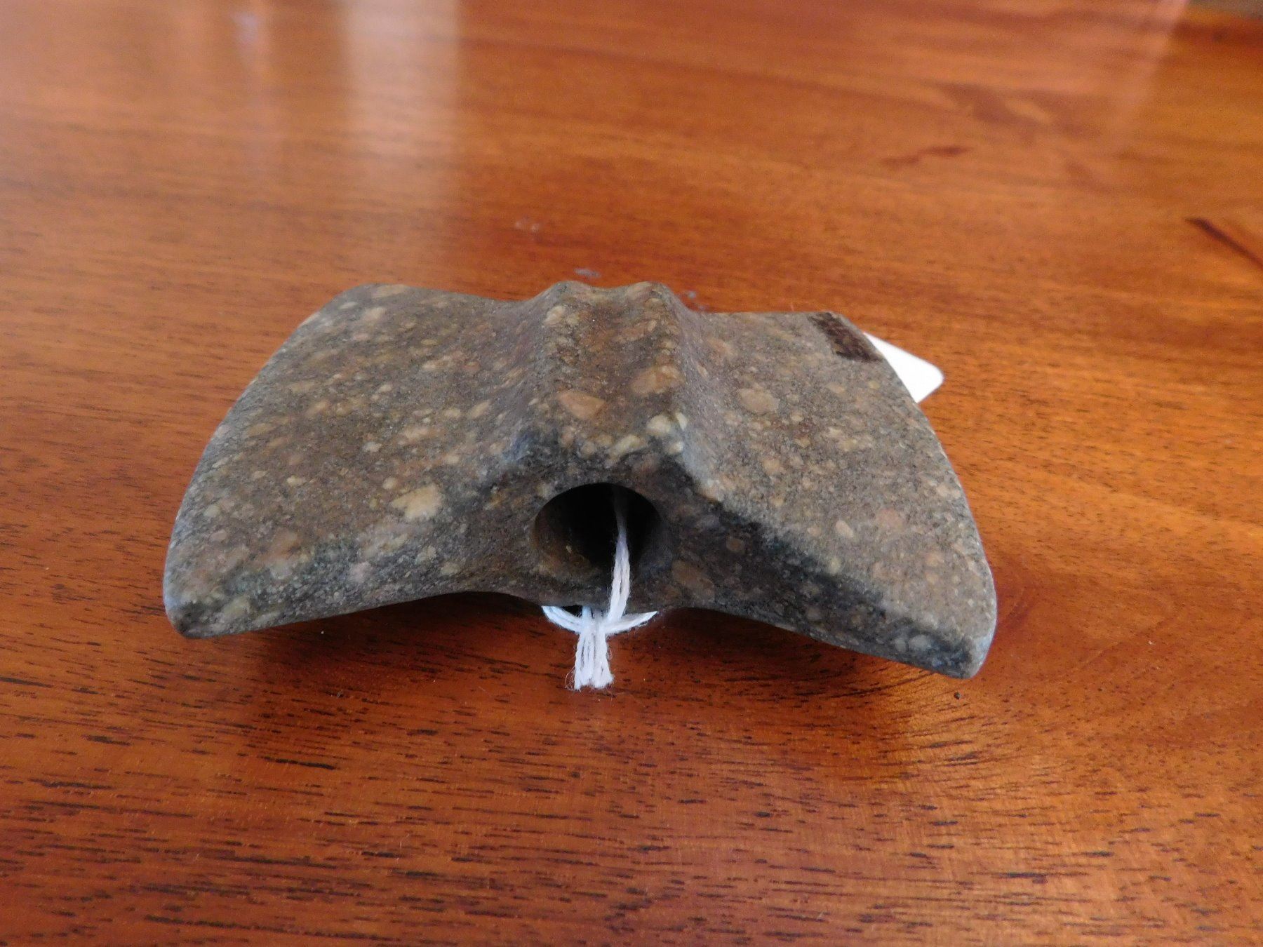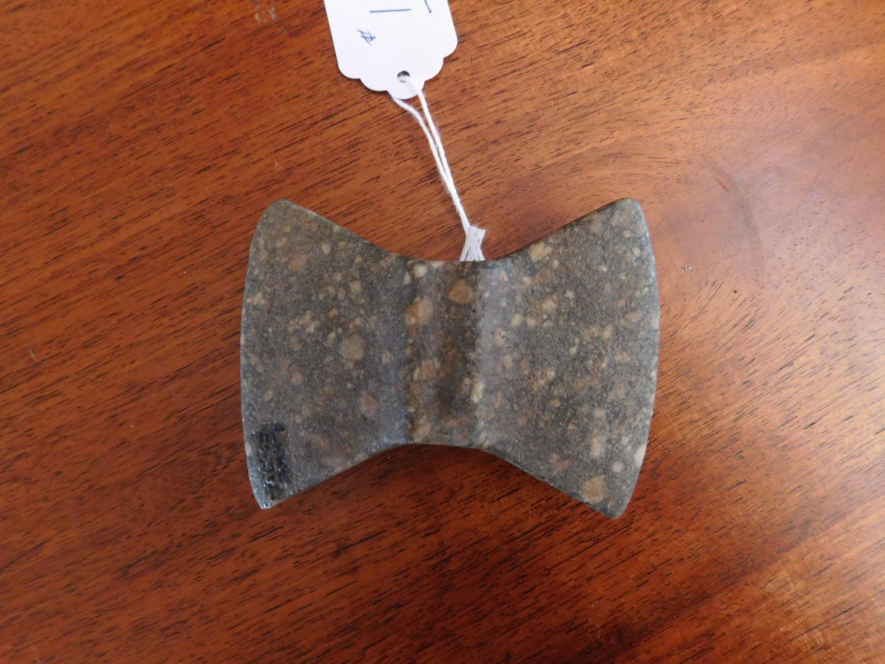 Bowtie Bannerstone, pre-historic item. Made of granite porphyry, the item measures 3 1/4" x 2 1/2" x 1 1/8", Ohio. Condition: Good, see images. Shipping: $13.50 w/insurance and signature.