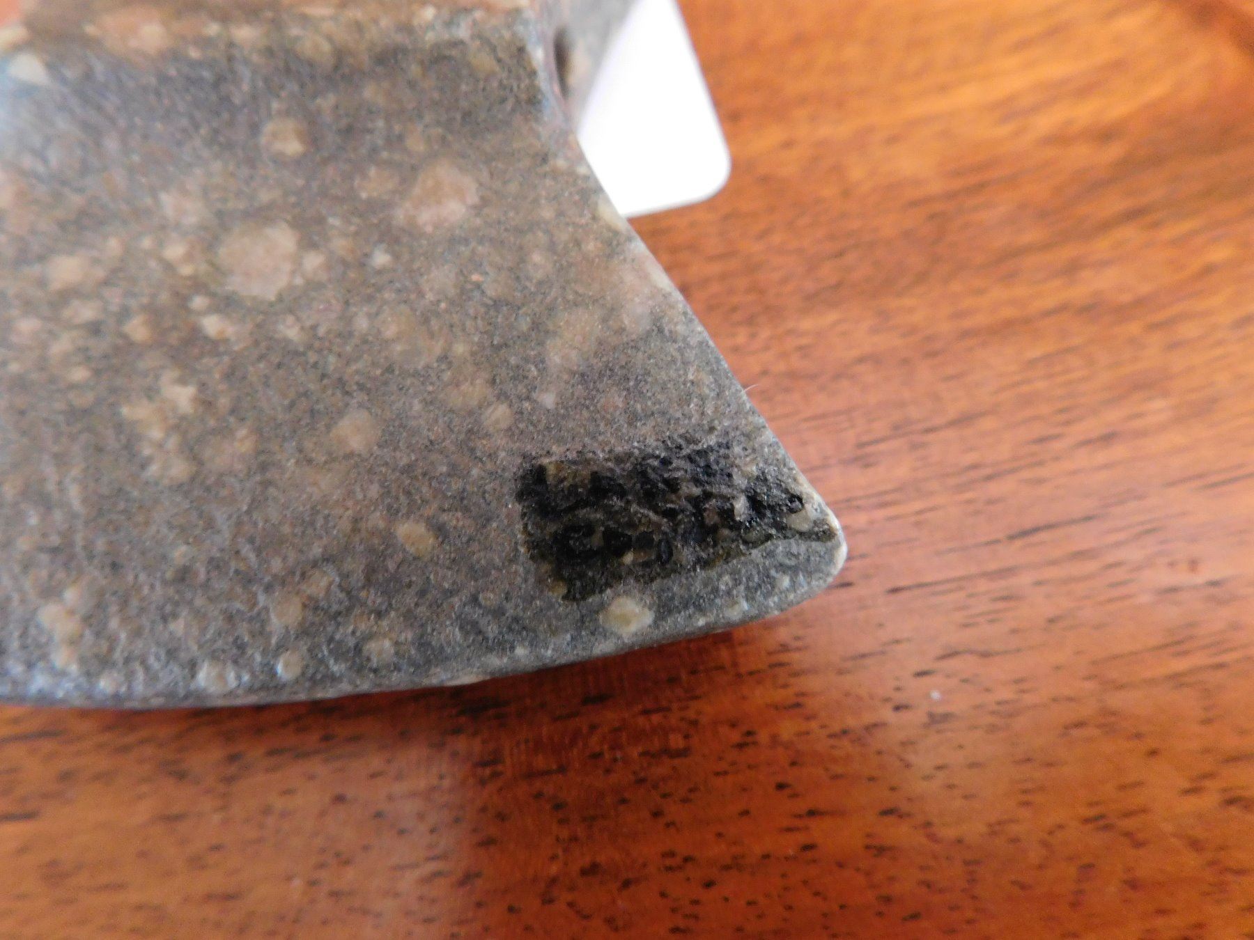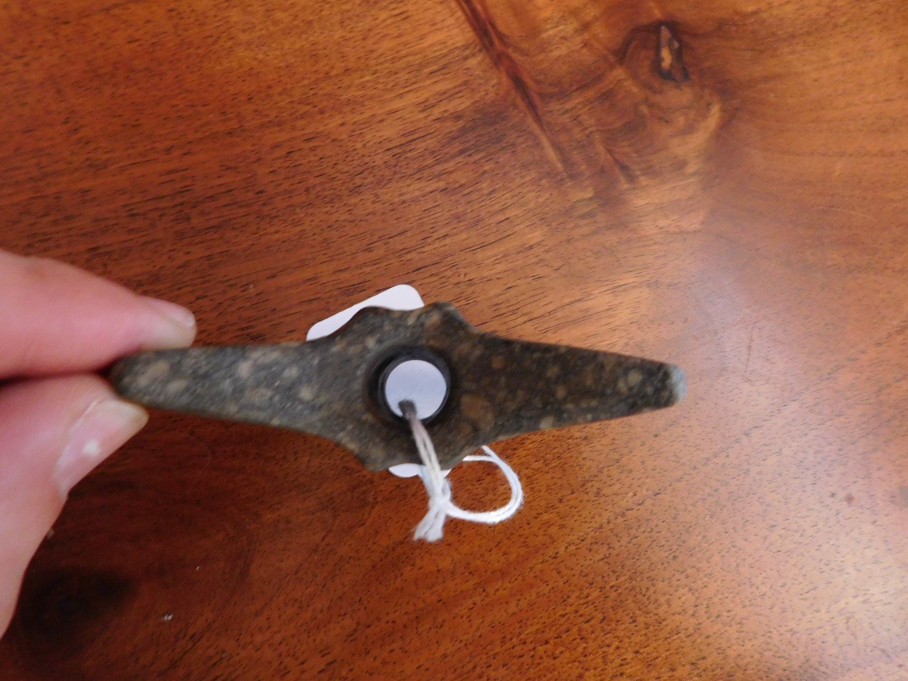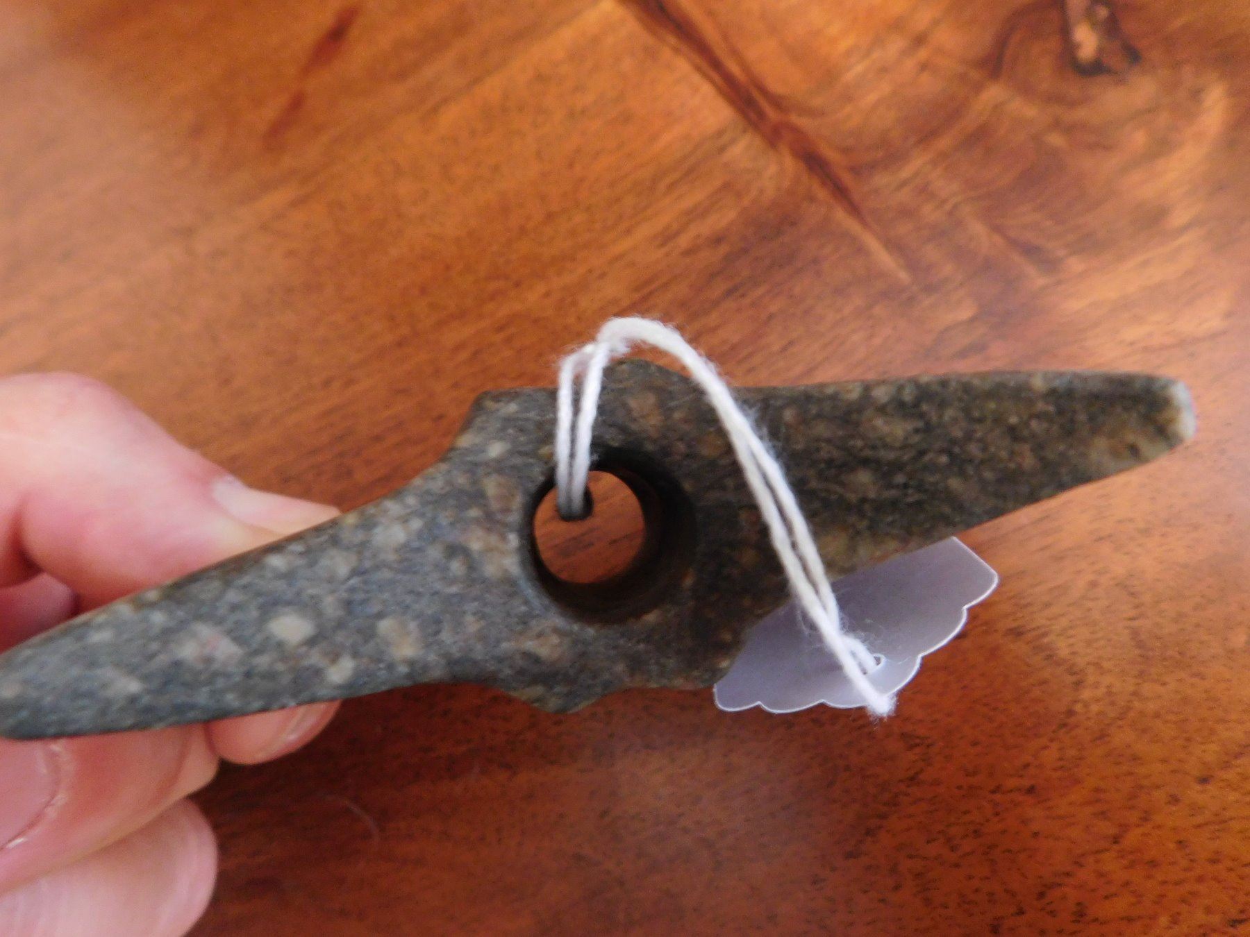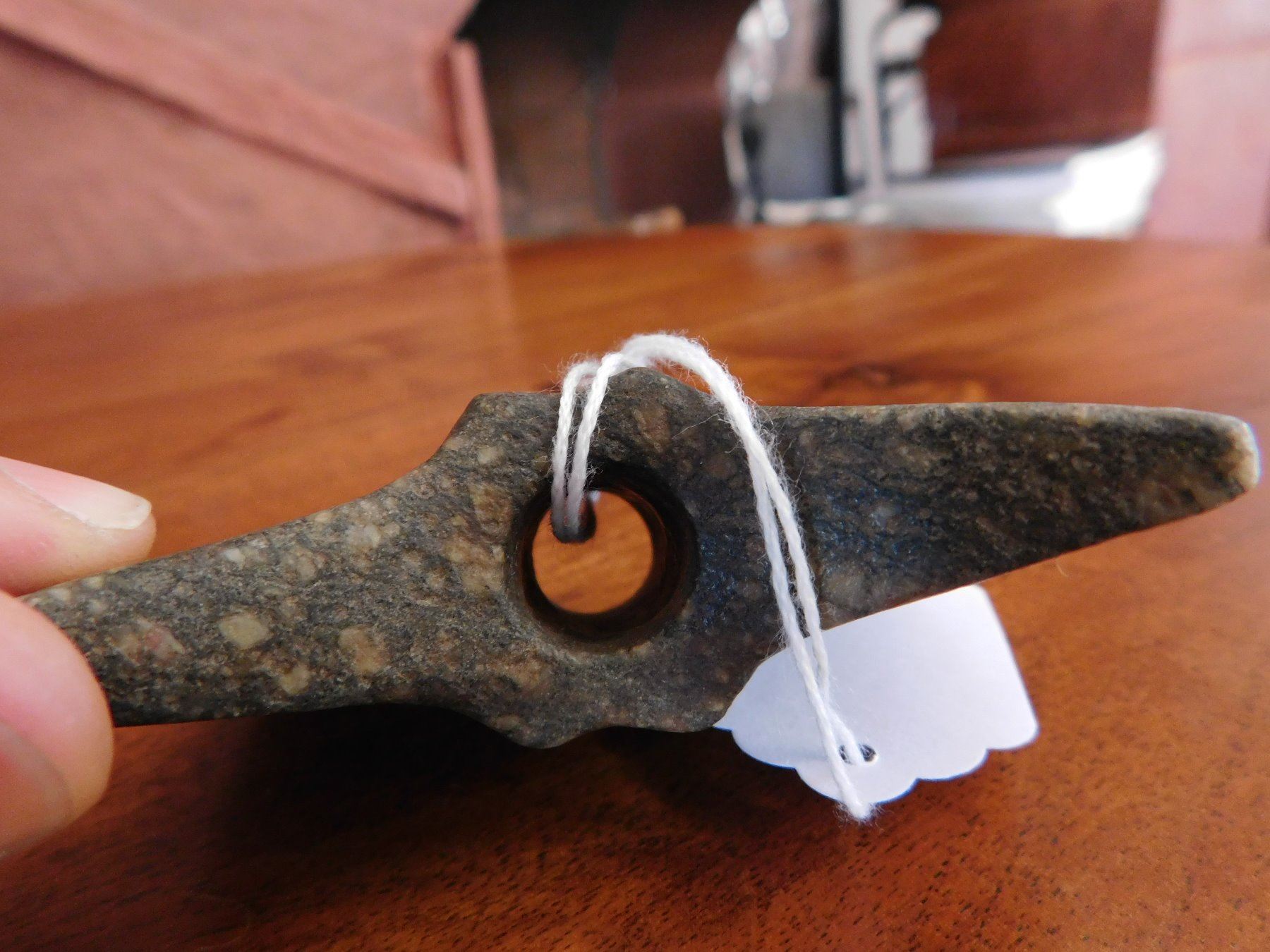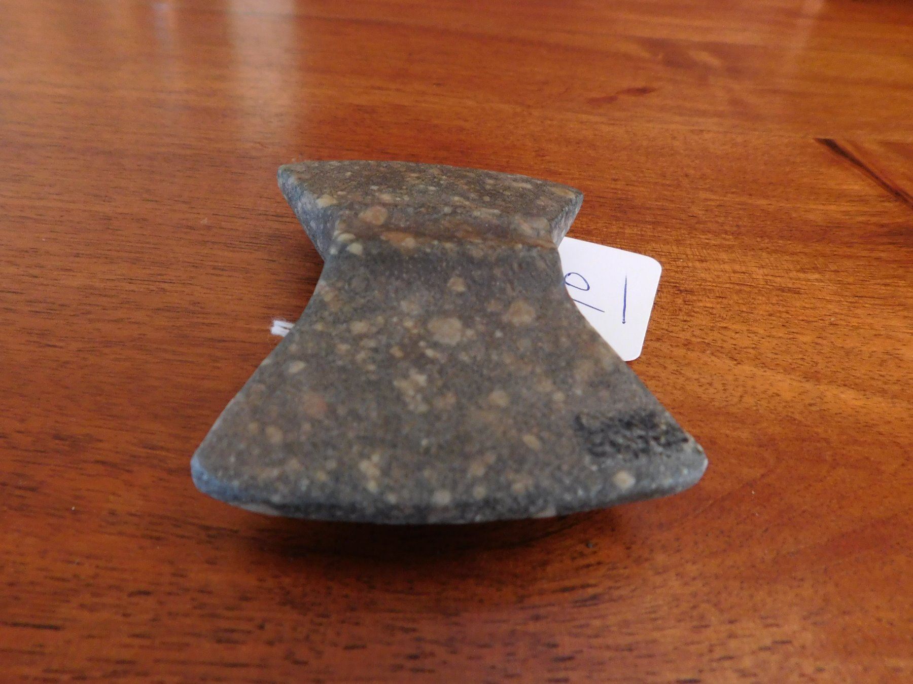 Bowtie Bannerstone, pre-historic item. Made of granite porphyry, the item measures 3 1/4" x 2 1/2" x 1 1/8", Ohio. Condition: Good, see images. Shipping: $13.50 w/insurance and signature.