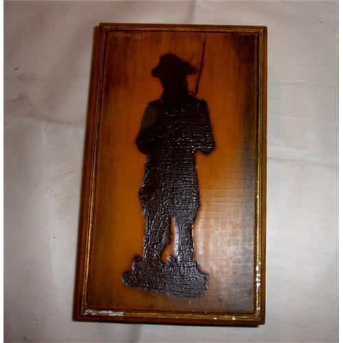 </font></strong>Vintage Dresser Box done in a woodburning/decoupage fashion. That is a silouette of an old soldier that appears to have been burned into the wood surface and filled with dark umber/black. Very unique collectible. In good condition for the age. Lovely old piece to store in or just look at. Could be lined for a small jewelry box for that favorite male in your life.