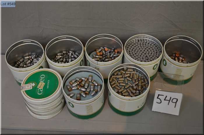 Box : 7 Tobbaco Cans ; lead bullets various calibers including : .32, .357 Mag, .44 etc.
