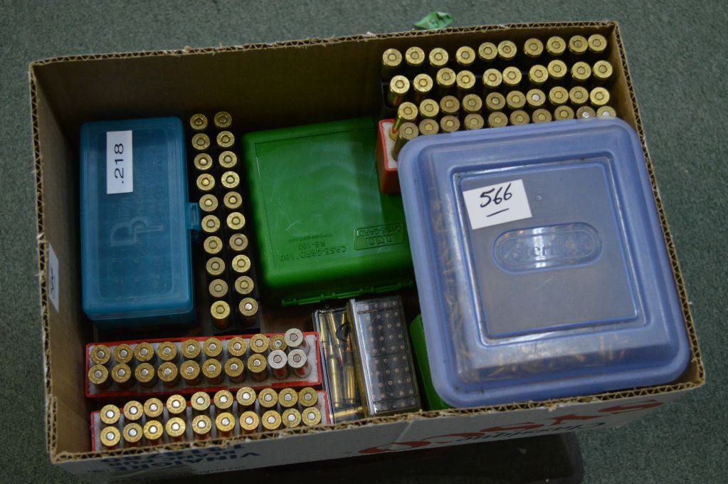 Box : Approx 450 Rnds of Reloaded Ammo [ various calibres ] - plus plastic container w/ .22 LR ammo