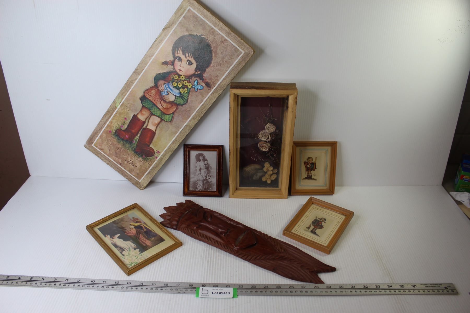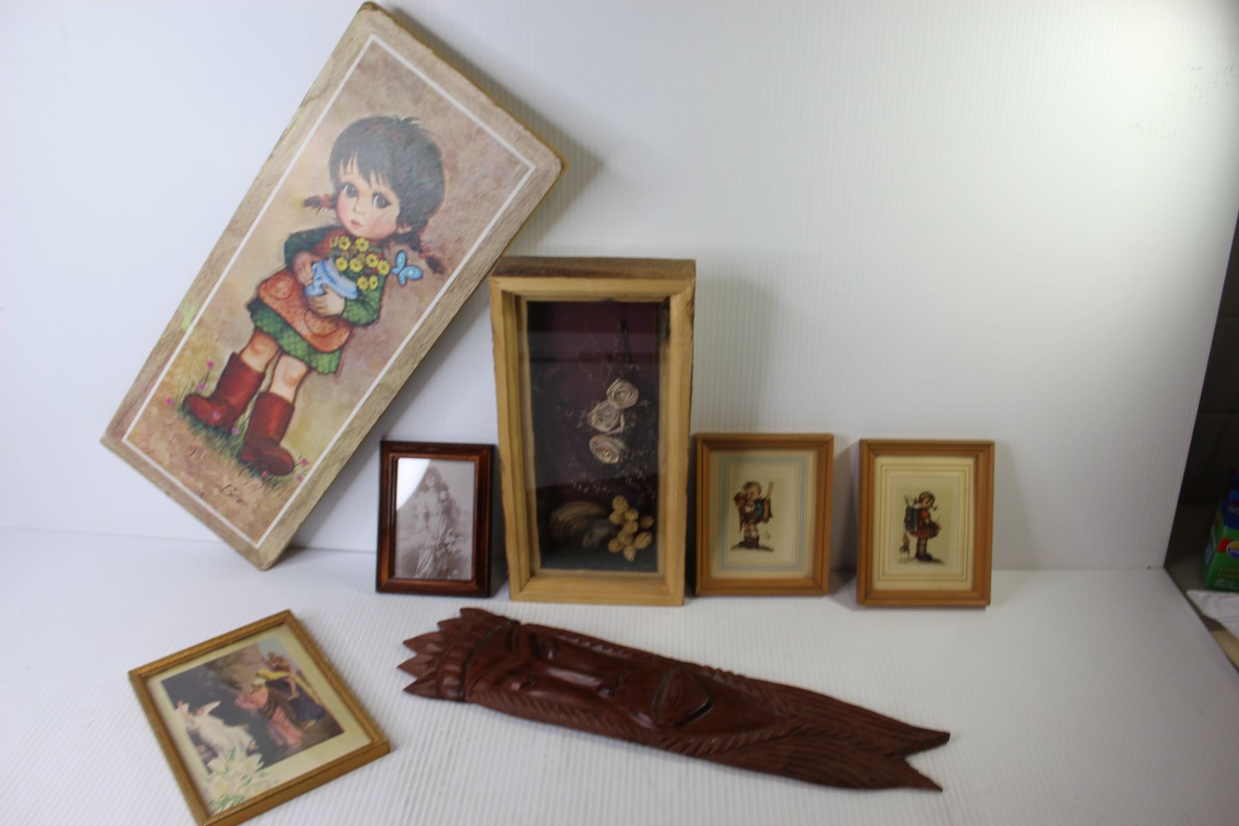 Box Framed Paper Flower Art - Small Famed Prints - Carved Kings Head? - Little Girl Print on Partial Board