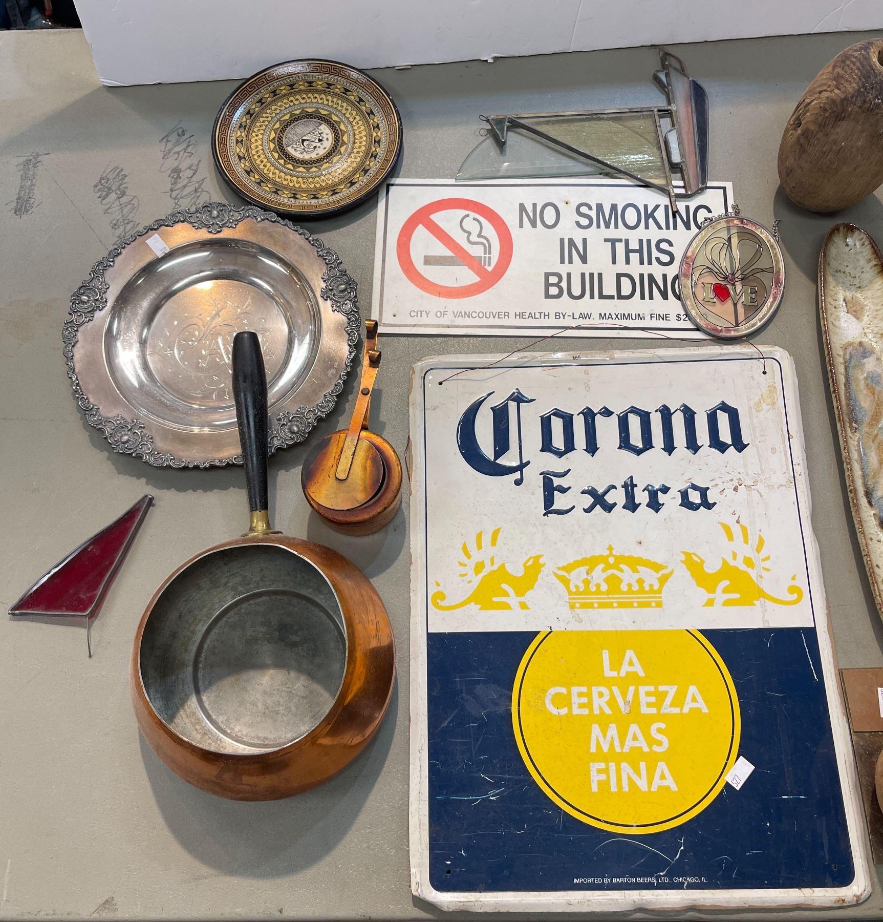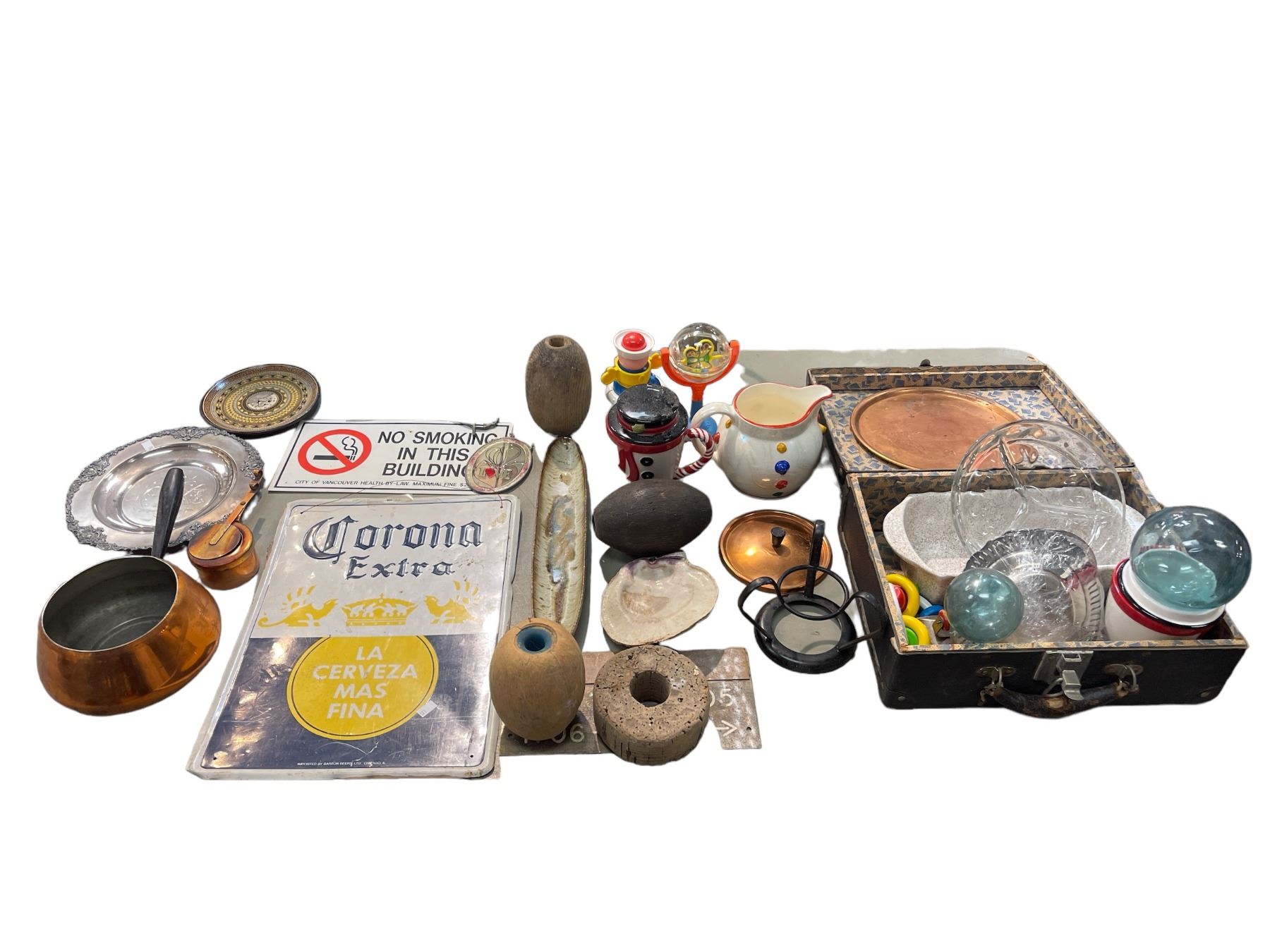 Box Full Of Assorted Collectibles, Toys, Plates, Signs, Pitcher, Etc..