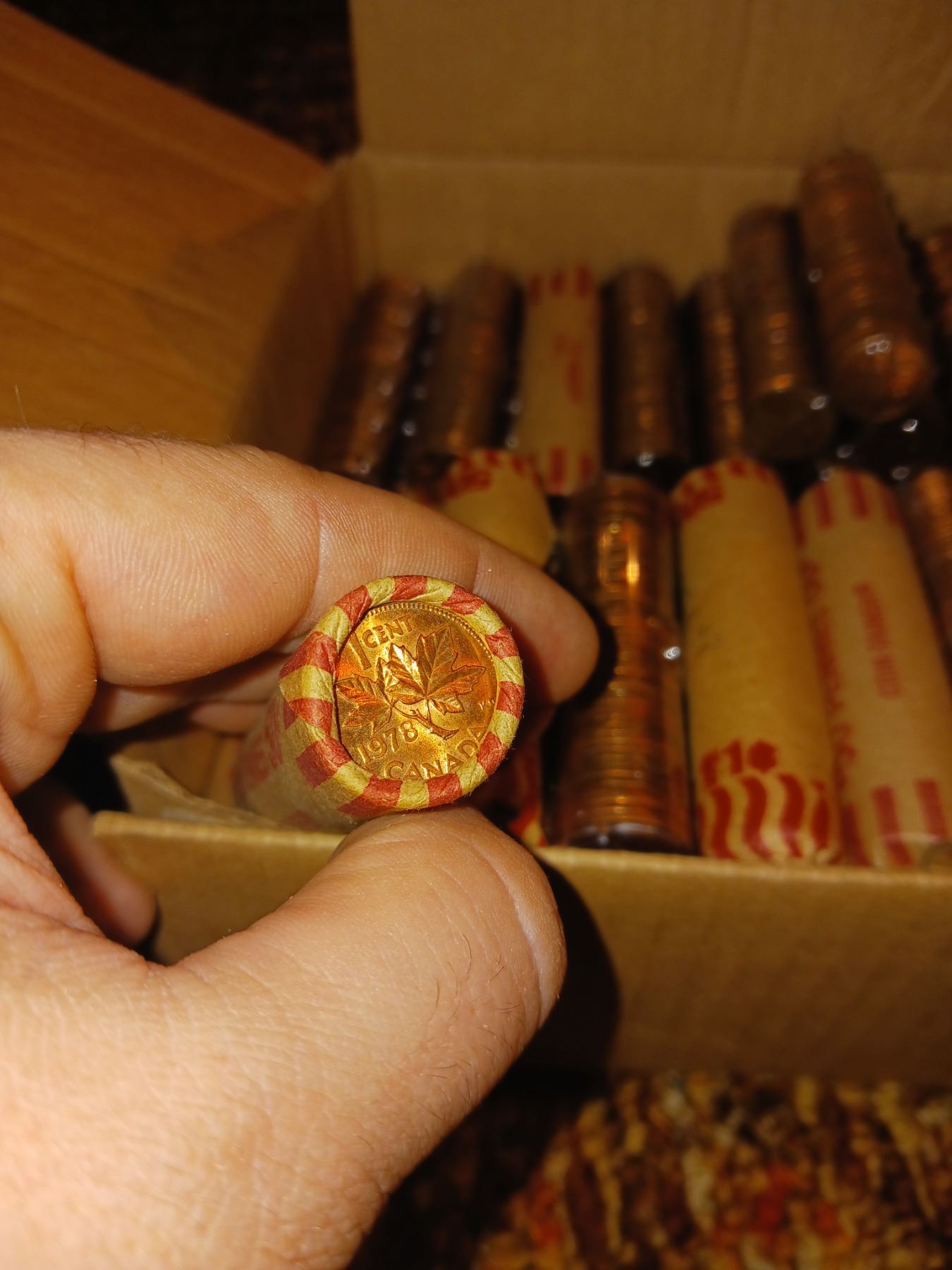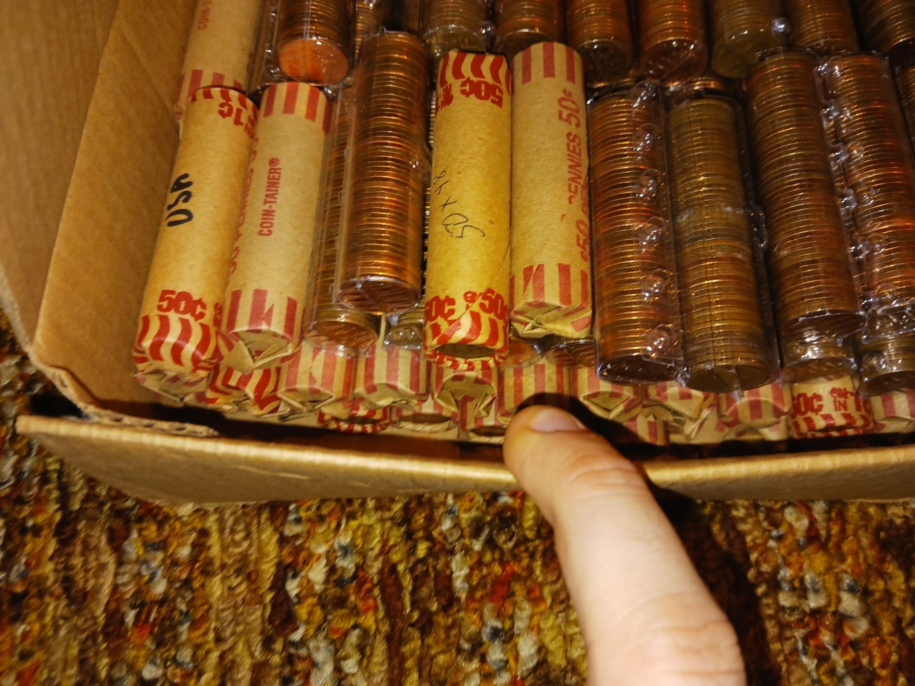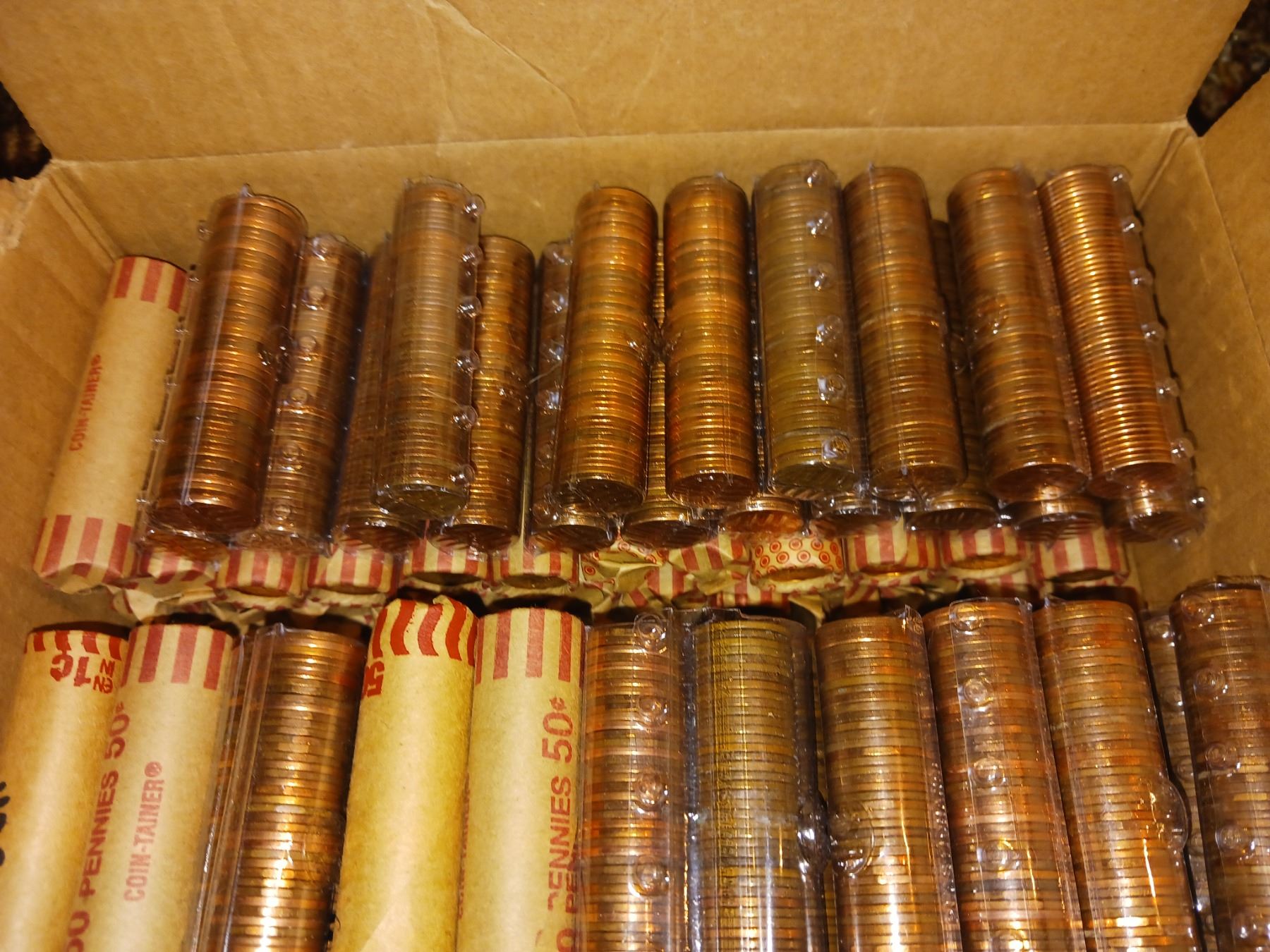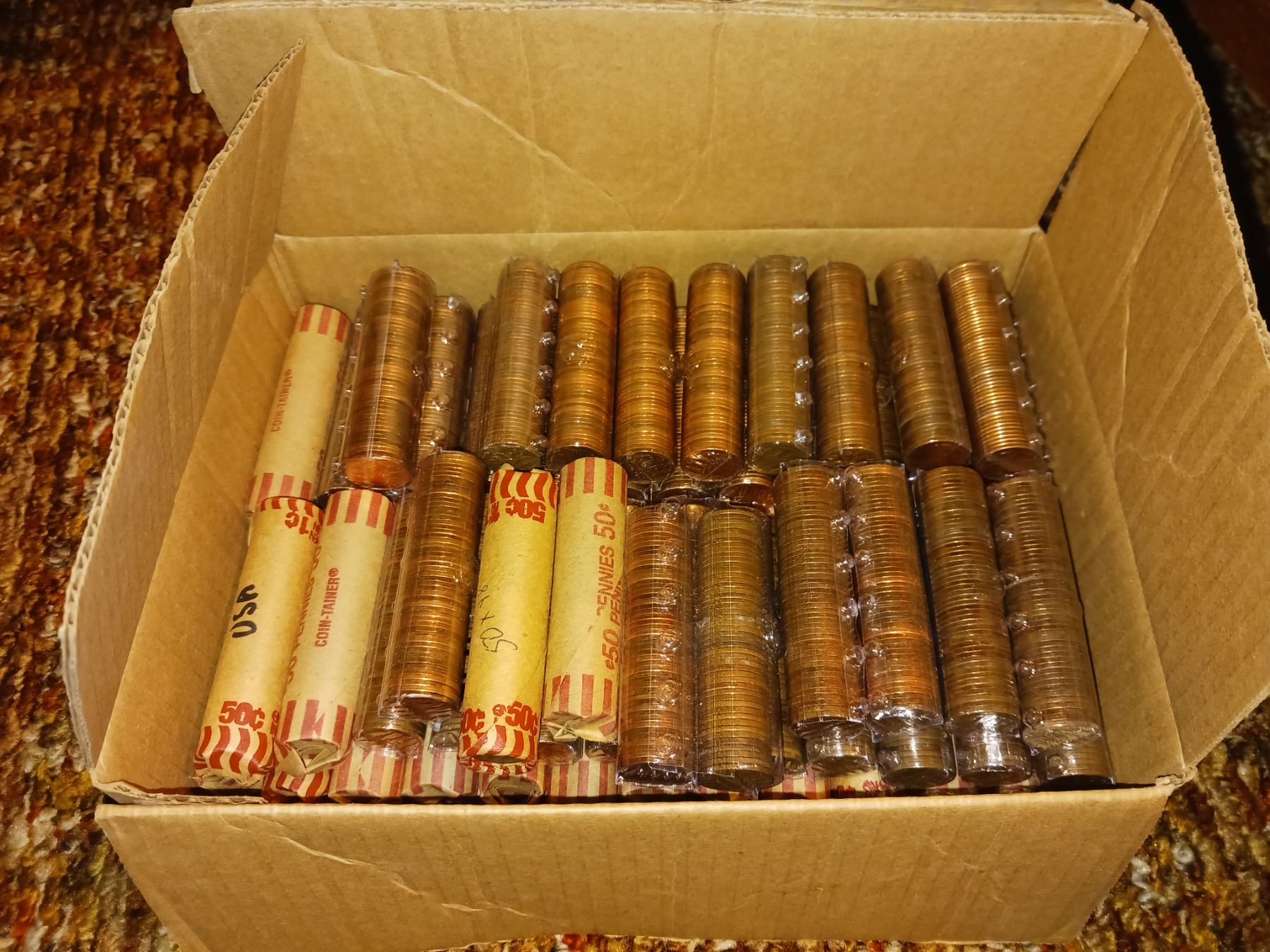 Box Full Of Rolls of Pennies - Copper, US and Canada - 4 Deep