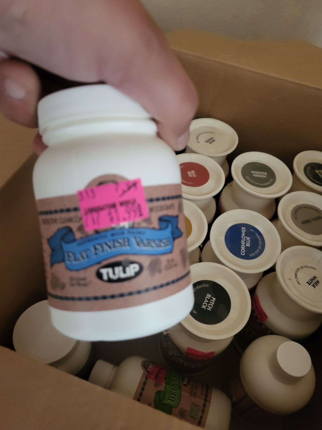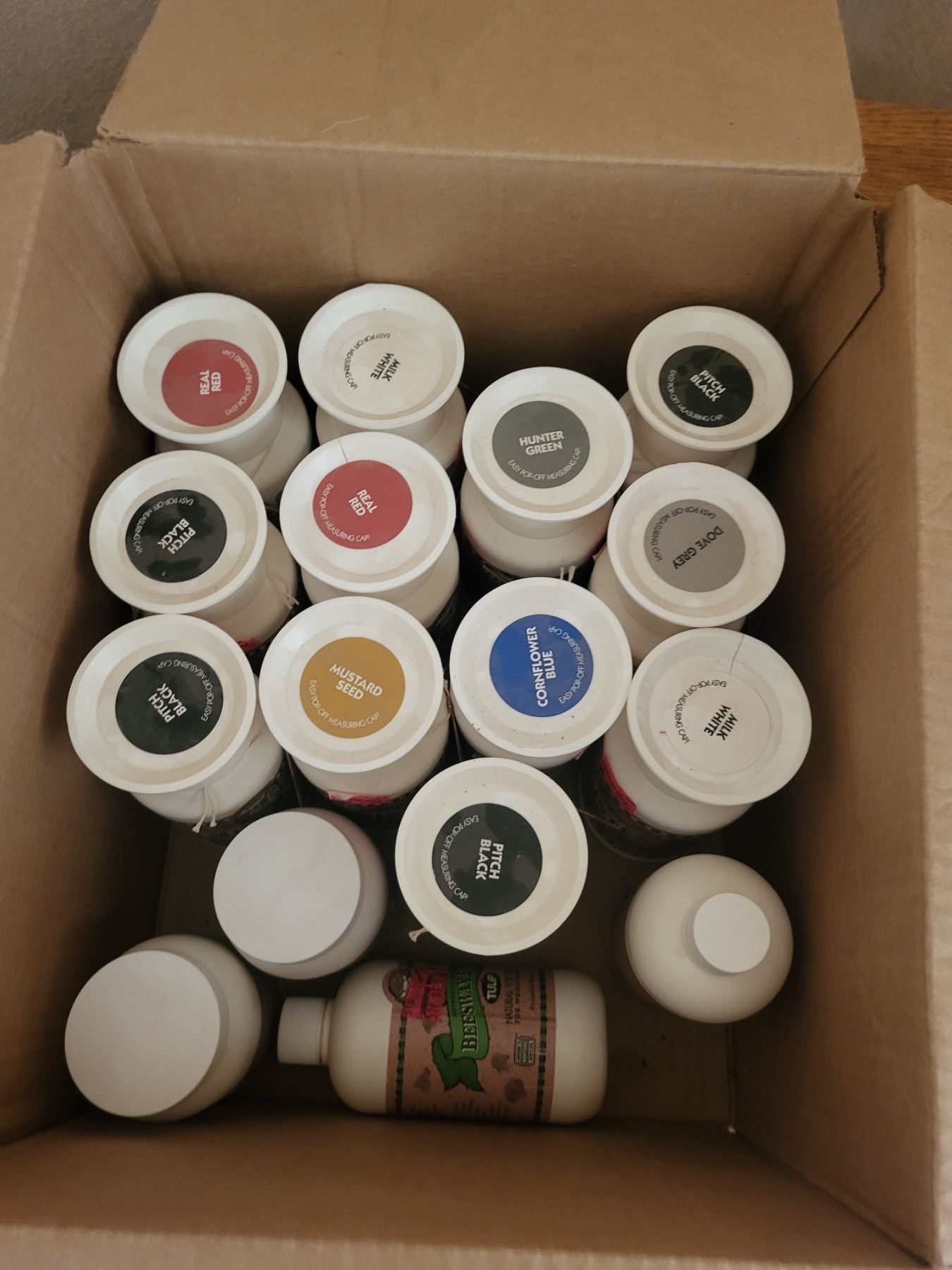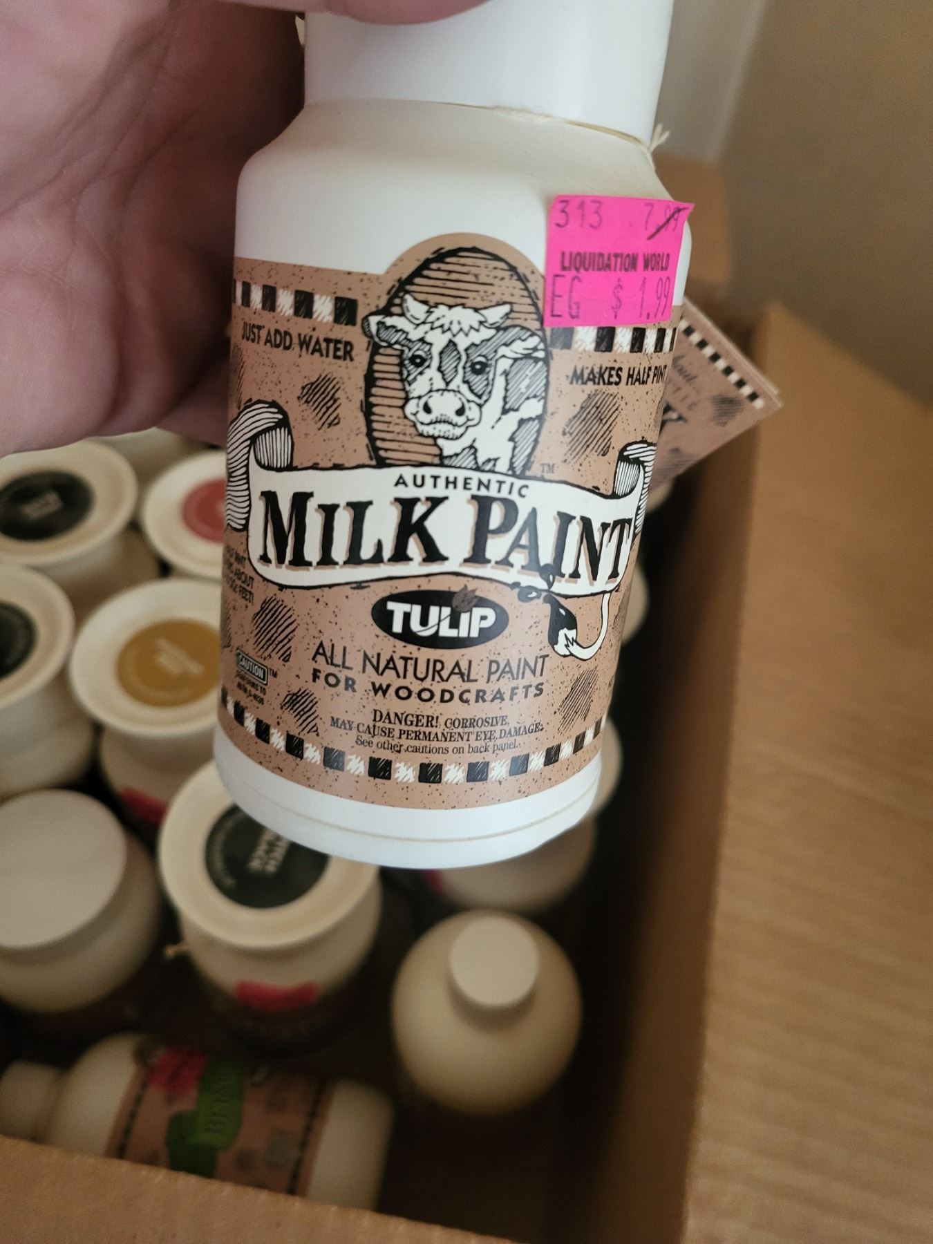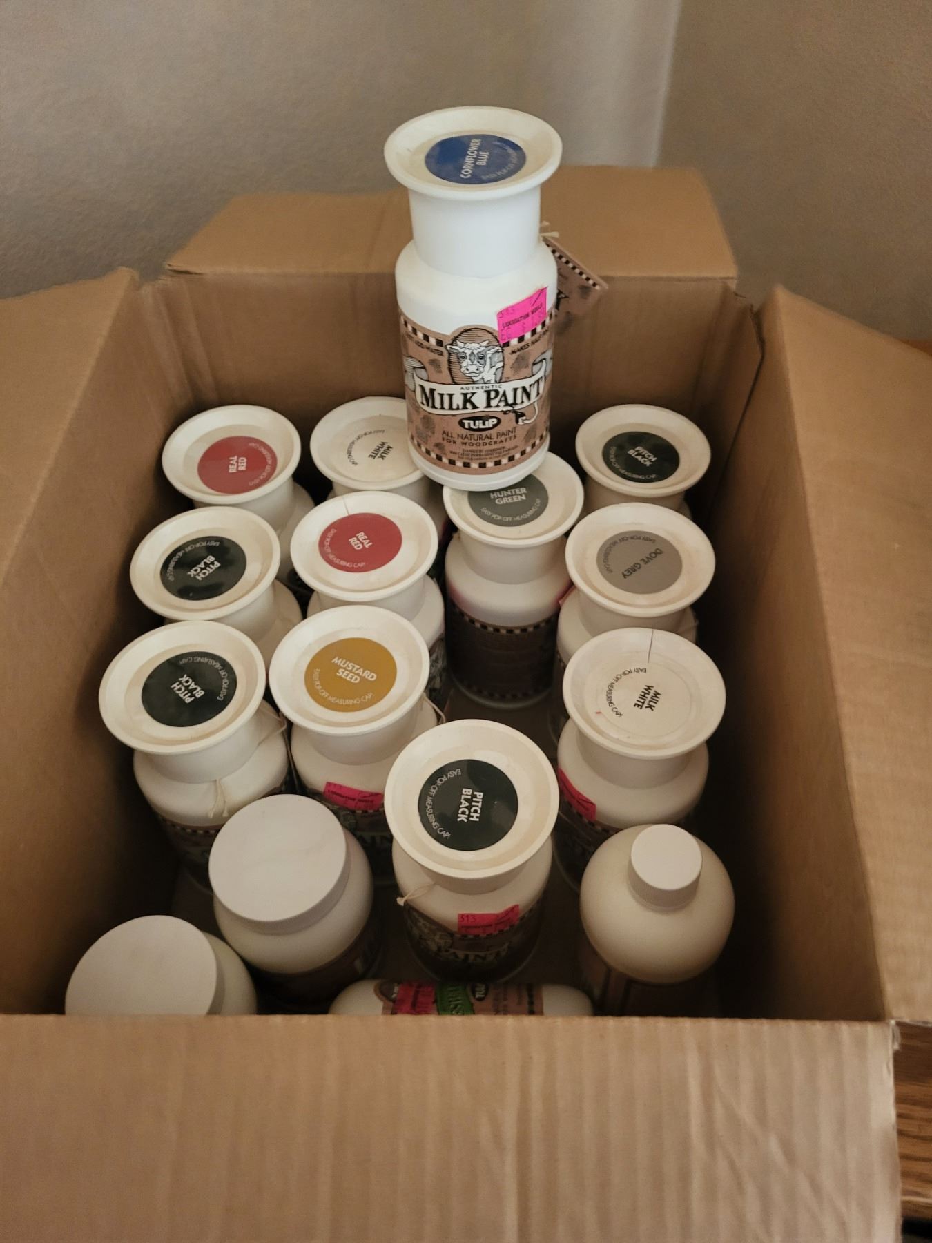 Box Full Of Tulip Milk Paint (Various Colours) And Varnish +