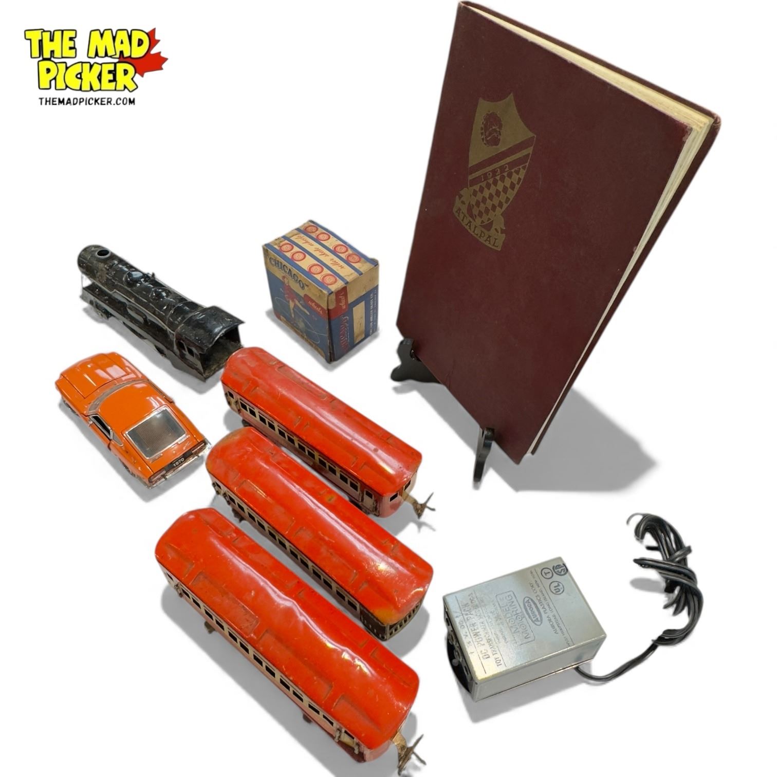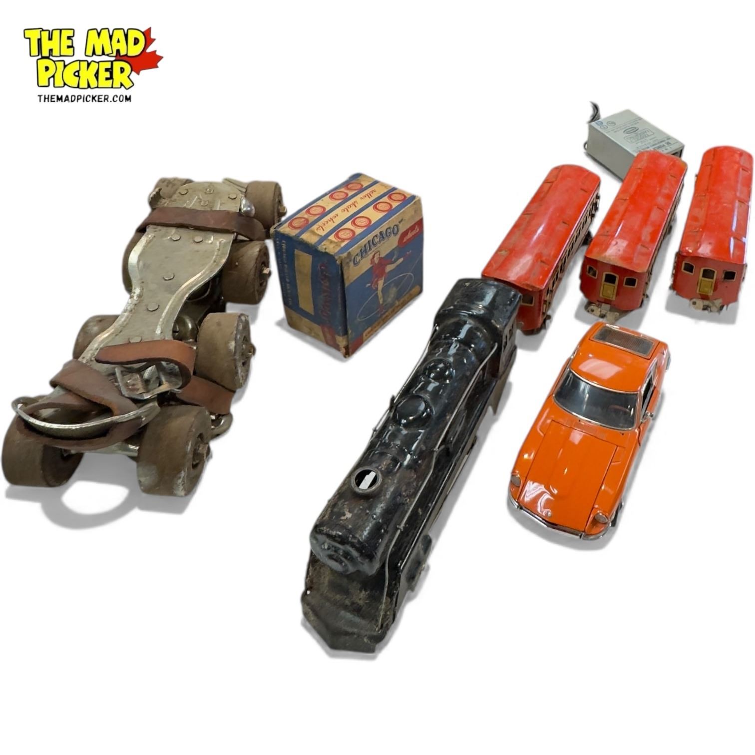 Box Full Of Vintage Collectibles, Tin Model Trains, Skates, Books, Etc…