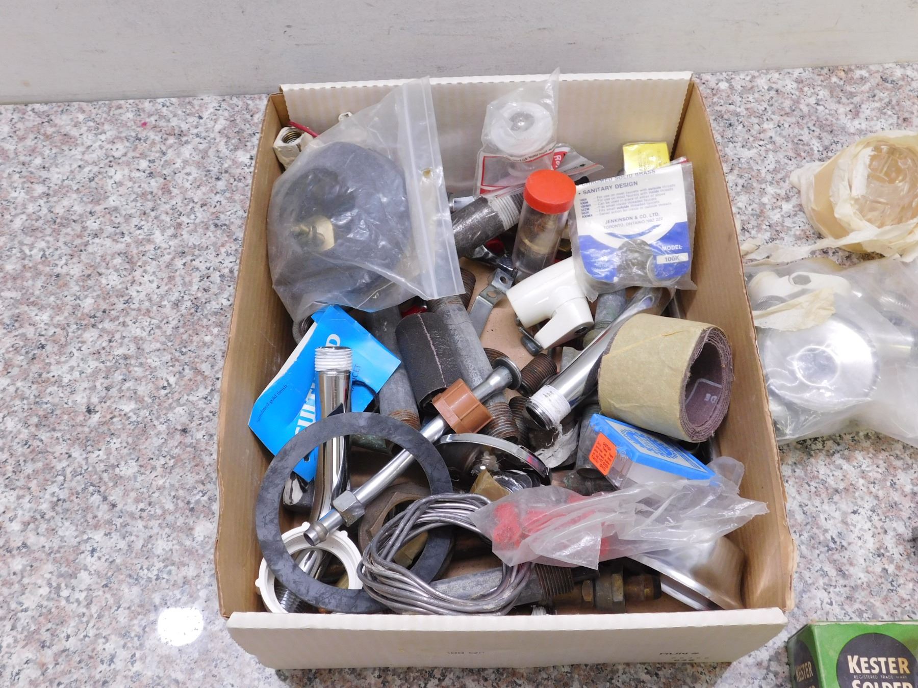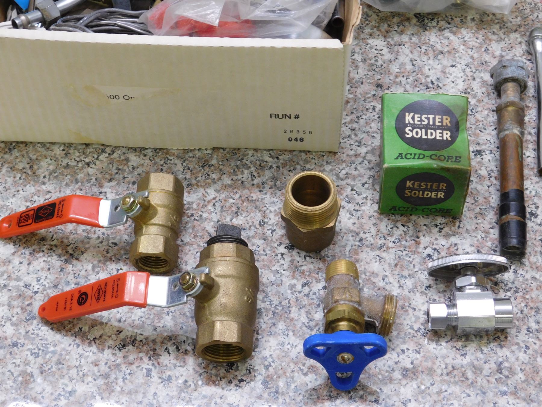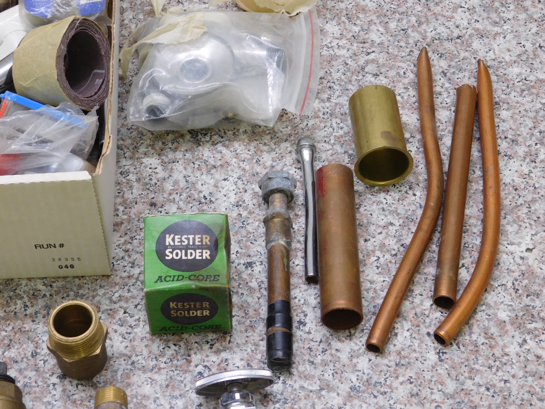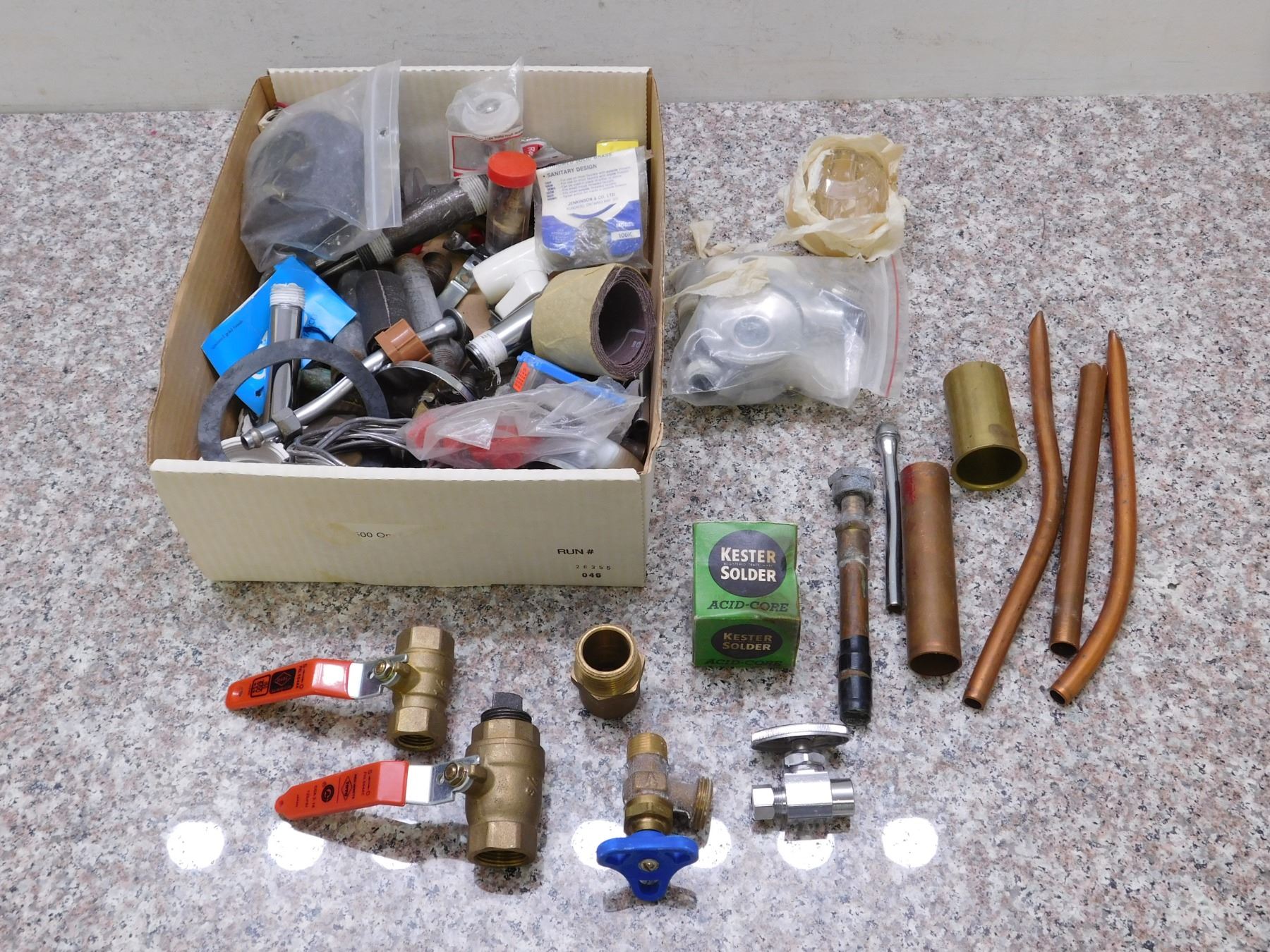Box Full of Plumbing Parts, Bronze Valve, Copper Tubing, Connectors, Solder, Etc