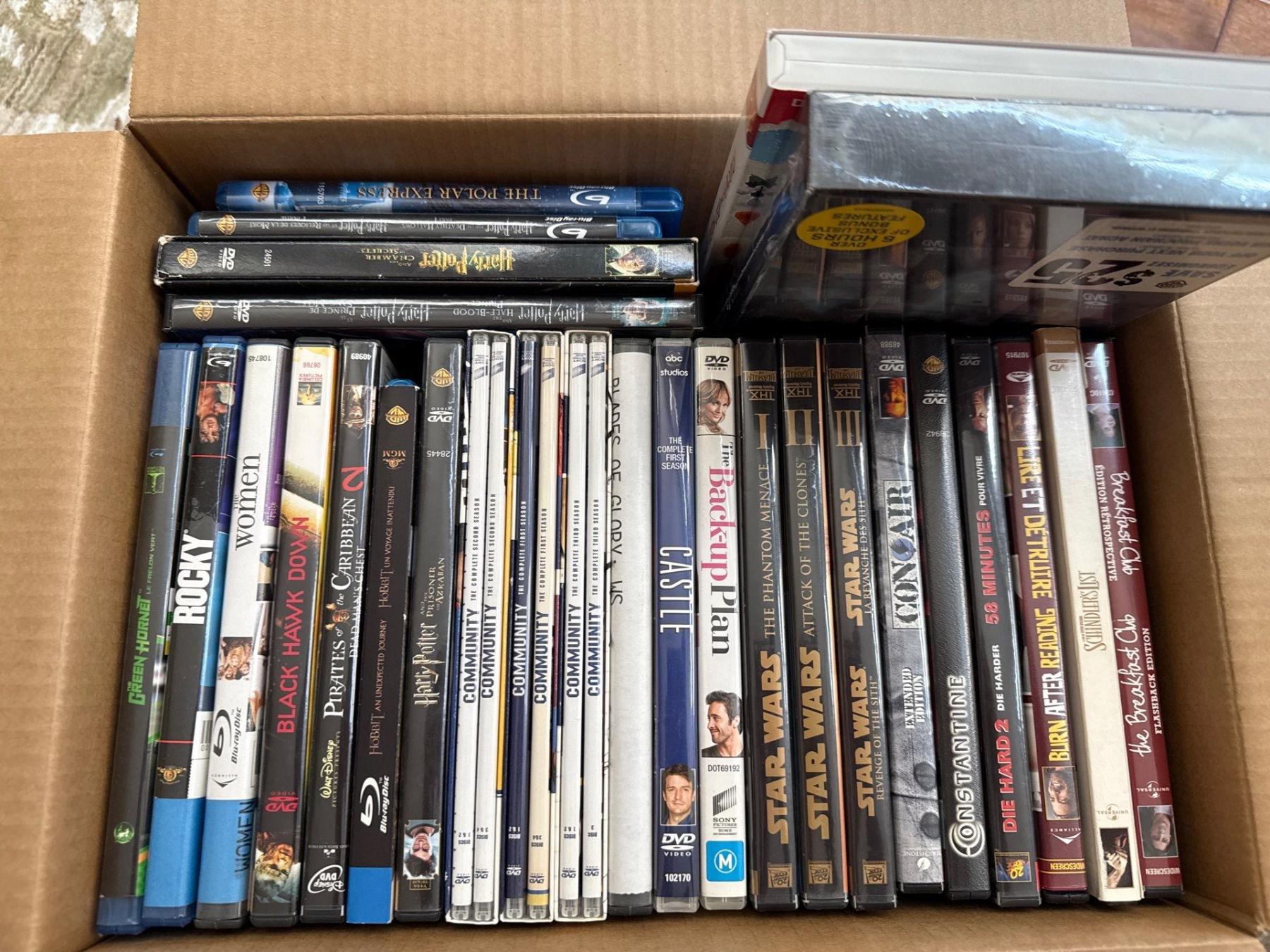 Box Full of Popular DVDs - Harry Potter, Hobbit, Star Wars, Die Hard and Much More