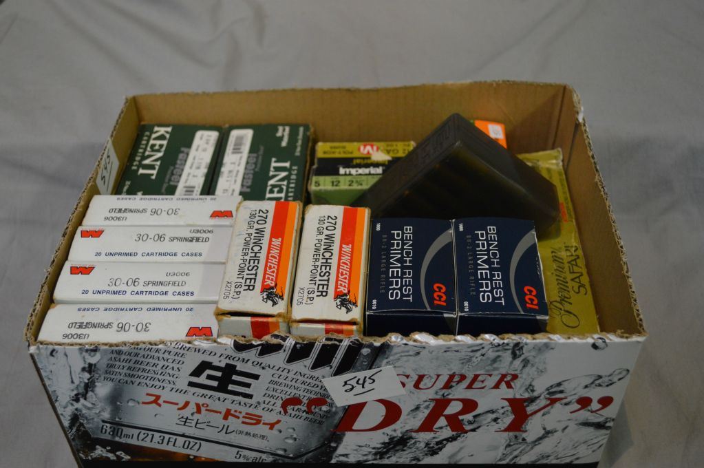 Box Lot : 1 3/4 Boxes Kent .12 Ga Fasteel Steel Water Fowl Shot Shells - 9 .12 GA slugs - 4 Boxes .30-06 Reloads - 39 Rnds .270 cal Reloads - 20 rnds .300 Win Mag - 2 Boxes ( 1000 rnds per ) Lg Rifle Bench Rifle Primers - Box Rem # 7 1/2 Small Rifle Primers - 15 rnds .30 - 30 Win ammo - 20 Rnds .300 Win Mag reloads -