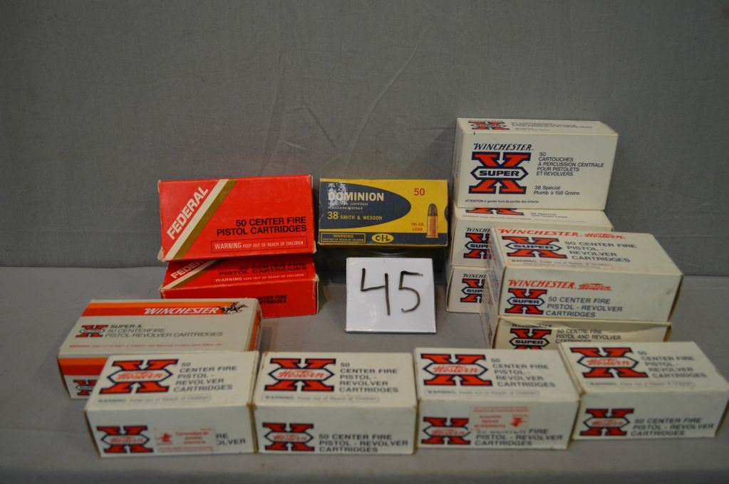 Box Lot : 13 Boxes .38 S & W cal Ammo ( 9 boxes Win, 2 boxes Federal, 1 Dom, 1 special )
