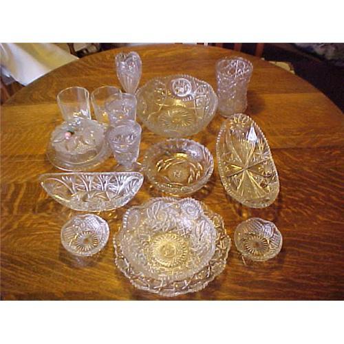 Box Lot-- 15 Pcs. (c) late 1899's- early 1900'sPressed--2 Boat dishes; (2) 12.5" 1 10"; 1 Rose Bowl; cut 7" diameter; 1 9" fruit bowl; 1 8" fruit b owl; 1 10" cake plate; 2 Water Goblets 5.5" tall; 2 Martini glasses; 4" tall; 1 butter dish lrg.;1 6.75" tall vase; 1 6" tall vae; 4" diam.
