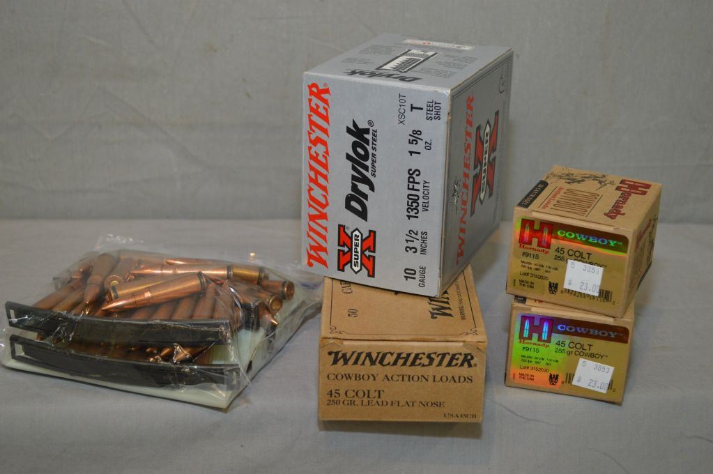 Box Lot : 24 Rnds Winchester .10 Ga 3 1/2" 1 5/8 Oz steel Shot Shells - 2 Boxes ( 20 rnds per ) Hornady Cowboy .45 Colt 255 Gr Ammo - Plus 1 Box ( 50 rnds ) Winchester .45 Colt Cowboy Action Loads 250 Gr Flat Nose Ammo - 60 Rnds 7.62 x 39 Cal Hard Pt Ammo [ some corrosive & some non corrosive ]