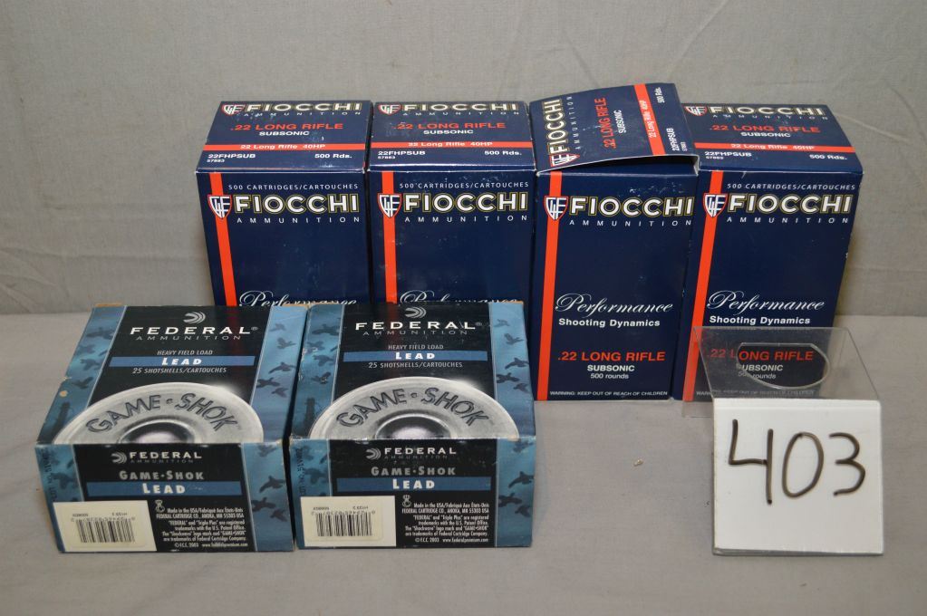 Box Lot : 4 Bricks ( 500 rds per ) Fiocchi .22 LR cal Subsonic Ammo - 2 Boxes ( 25 rnds ) Federal .12 Ga 2 3/4" # 2 Shot Shells