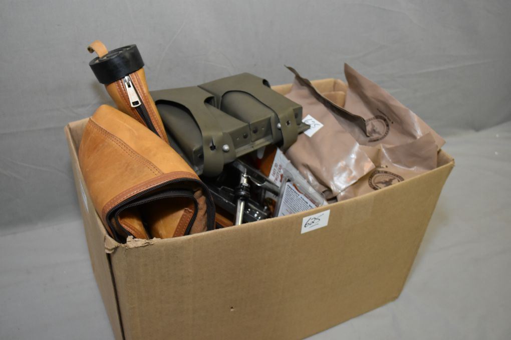 Box Lot : 64 Pattern Roughsack [ that has been modified ] - Four Ration Packs - 2 G3 Plastic ammo pouches - Cartridge Wallet - Two Reloading Primer Trays ? - Winwell Gun Case