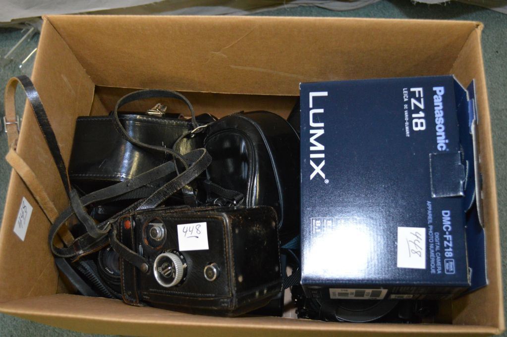 Box Lot : 9 Collectable Cameras [ Nikkormat Model EL w/18 mm lense & case - Nikon Model F70 w/ Nikon 24 - 120 mm lense w/case - Pentacon six TL w/ 58 mm lense & case - Nikon Model PRONEA 600i w/ 24 - 70 mm lense no case - Nikon EL w/ 86 mm Zoom lense - Nikkormat Model EL w/ 50 mm lense & case - Panasonic Lumix w/18 X optical zoom , extra lense w/orig box - Veighaneer Model PERKEO I ( Made in Germany ) no case - Rolleiflex Box Style Movie Camera ( Made in Germany) w/ orig case