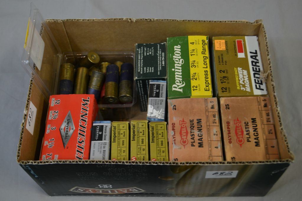 Box Lot : Approx 5 Boxes .12 Ga Shot Shells : Winchester, Gevelot, Remington - Box ( 10 rnds ) .12 Ga Bismuth - 5 Boxes ( 5 rnds) 0 Buck & 00 Buck - Some loose .12 Ga including : Swift Current Ducks Unlimited Brass Shell