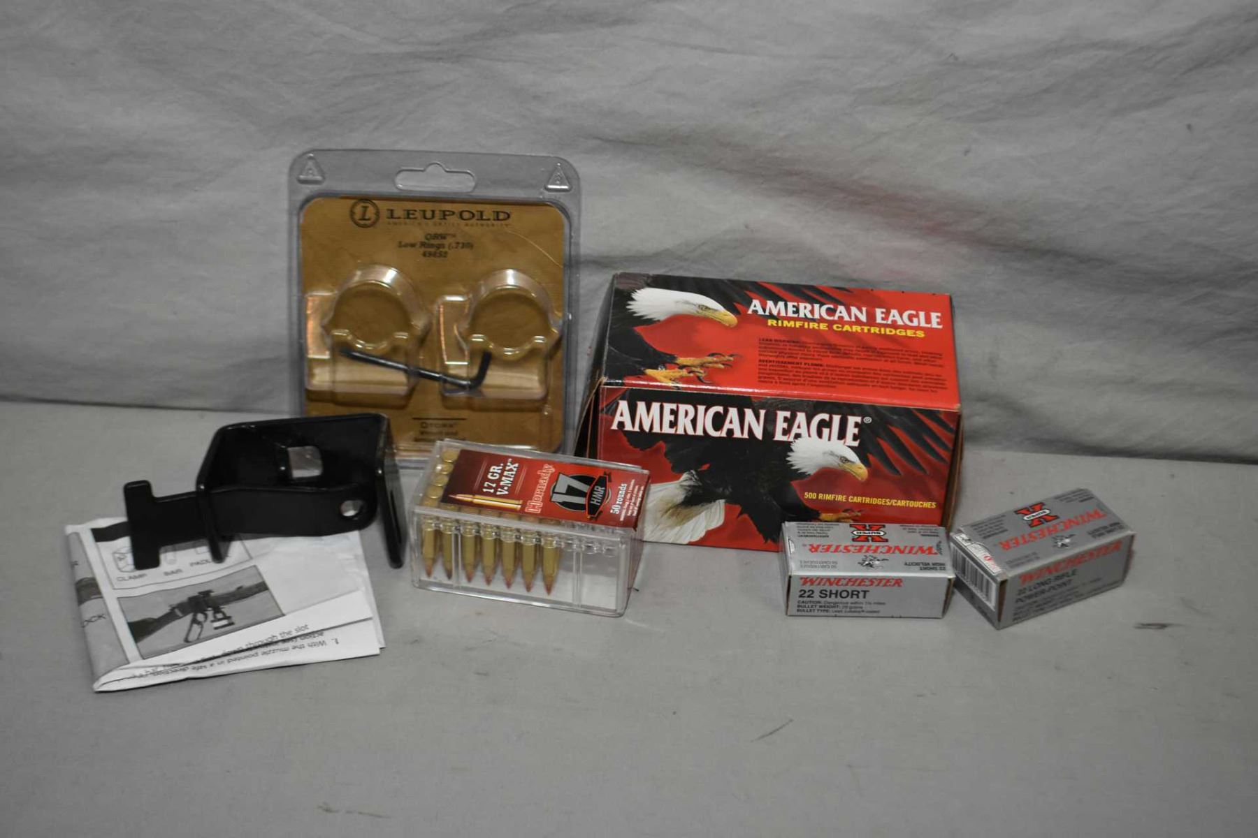 Box Lot : Approx. 9 & One Part Boxes American Eagle .22 LR Cal Ammo - approx. 1 Box Winchester Super X .22 LR Cal Ammo - Approx. 3/4 Box Winchester .22 Short Cal Ammo - 33 Rnds .17 HMR Cal Ammo - black receiver clamp with instructions, etc.