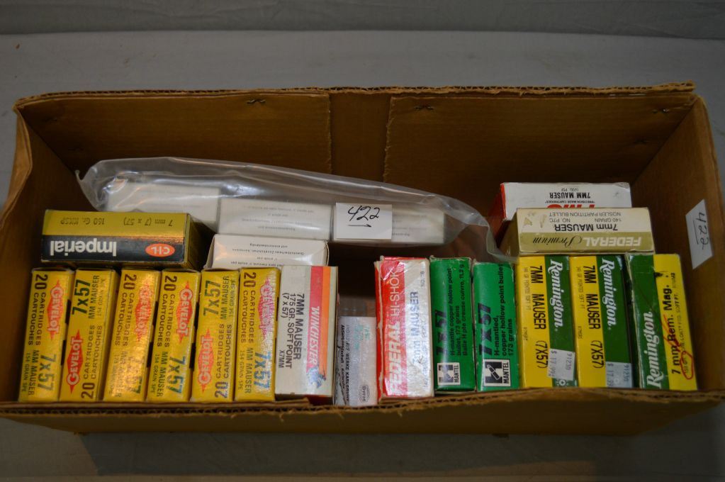 Box Lot : Approx Eighteen Boxes of .7 MM Mauser or 7 x 57 Ammo in 21 Boxes as some are part full [ various grains & makers includ : Gevelot, Remington, RWS, etc.