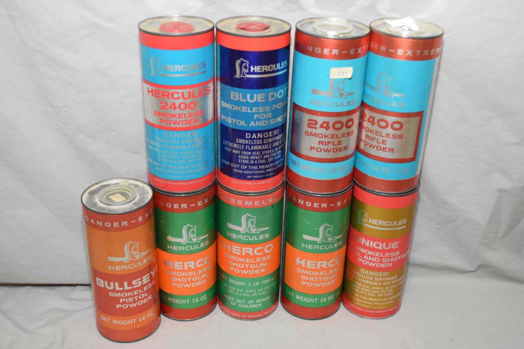 Box Lot : Asstd Gun Powder : Approx. 1 1/2 Lbs Herco - 1 Lb Unique Pistol & Shotgun - Approx. 2 1/2 Lbs Hercules 2400 Rifle - Approx. 1 Lb Blue Dot Pistol & Shotgun - Pt Can Bullseye Pistol